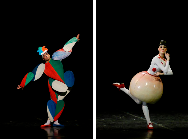Son centre de gravité perturbé par la lourdeur d'un tutu-assiette en bois, la danseuse (délicate Nagisa Hatano) n'a plus que le choix de « conditionner ses mouvements non plus sentimentalement mais mécaniquement, rationnellement ». Son partenaire, le scaphandrier (Nicholas Losada), s'élance telle une toupie vers sa partenaire. Privé de bras et la vue obstruée par son casque, en apesanteur, il se fie machinalement à l'espace. Comme l'a souligné l'historienne de la danse Laurence Louppe, « la force de Schlemmer est d'avoir construit ses costumes comme des récits. Chacun dicte au corps qu'il enclot la partition des mouvements possibles. Chacun est une chorégraphie : il sélectionne un certain nombre de gestes choisis en inhibant les autres. » Mention spéciale au duo de disques dont les costumes segmentent symétriquement les corps des danseurs (Alexander Bennett et Nicholas Losada) en deux ! Plus folkloriques, les costumes et accessoires turcs et la jupe à boules bigarrées de mademoiselle (pimpante Pauline Simon !), rappellent ceux de Petrouchka. Et Schlemmer de continuer à s'interroger : « La sphère, la demi-sphère, le cylindre, l'assiette, les disques, la spirale, les ellipses, etc. ne sont-ils pas les formes spatiales de la danse et les éléments de mouvement et de rotation par excellence ? »