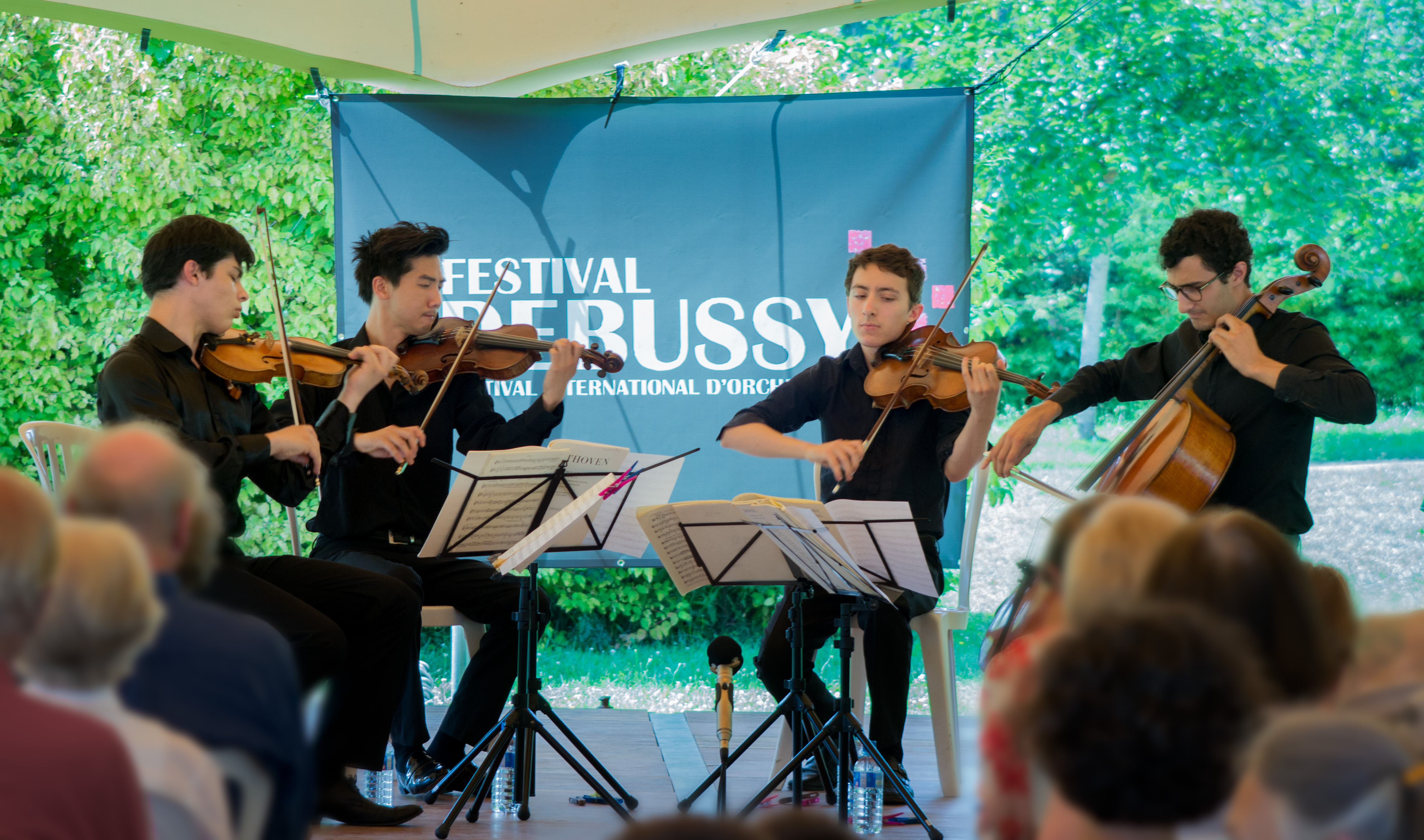 Les concerts de l'après-midi sont accès sur une formation de musique de chambre, y compris un quintette à vent. Ainsi, le 26 juillet, nous avons entendu la soprano Marie Perbost et la pianiste Flore Merlin qui, dans l'idée de parcourir Paris en musique, construisent un programme à partir de musique de Poulenc. Il s'agit d'un petit panorama de mélodies françaises, d'une grande richesse, stylistiquement très variées, à travers Poulenc (cycle Banalités, Les chemins de l'amour), Satie (Je te veux), Roussel (Le Jardin mouillée), Debussy (cycle Ariettes oubliées) Hahn (« C'est pas Paris, c'est sa banlieue », extrait de Ciboulette) et enfin, Charles Lecoq (1832-1918 ; « Ô Paris, gai séjour », extrait des Cent Vierges). Marie Perbost, qui commente brièvement chaque pièce avant de chanter, est très à l'aise dans ce répertoire, sa voix à une émission naturelle et sa belle diction l'atteste. Défenseuse de l'opérette, elle interprète à la fin le vaste air de Gabrielle des Cent Vierges de Lecocq et c'est un beau cadeau à l'auditoire qui a perdu l'habitude d'entendre une belle exécution d'un air d'opérette. Flore Merlin, qui semble elle aussi avoir une connaissance approfondie du répertoire, soutien avec bonheur la chanteuse. En fin de l'après-midi, c'est au tour du Quintette Aquilon de monter sur cette scène en pleine air. Les cinq jeunes femmes, tenant la flûte, le hautbois, la clarinette, le cor et le basson, enchantent le public avec des transcriptions du Tombeau de Couperin de Ravel et de Children's Corner de Debussy, mais aussi le Divertimento en si bémol de Haydn et une rareté pour le public, le Quintette en ut majeur du compositeur allemand August Klughardt (1847-1902).