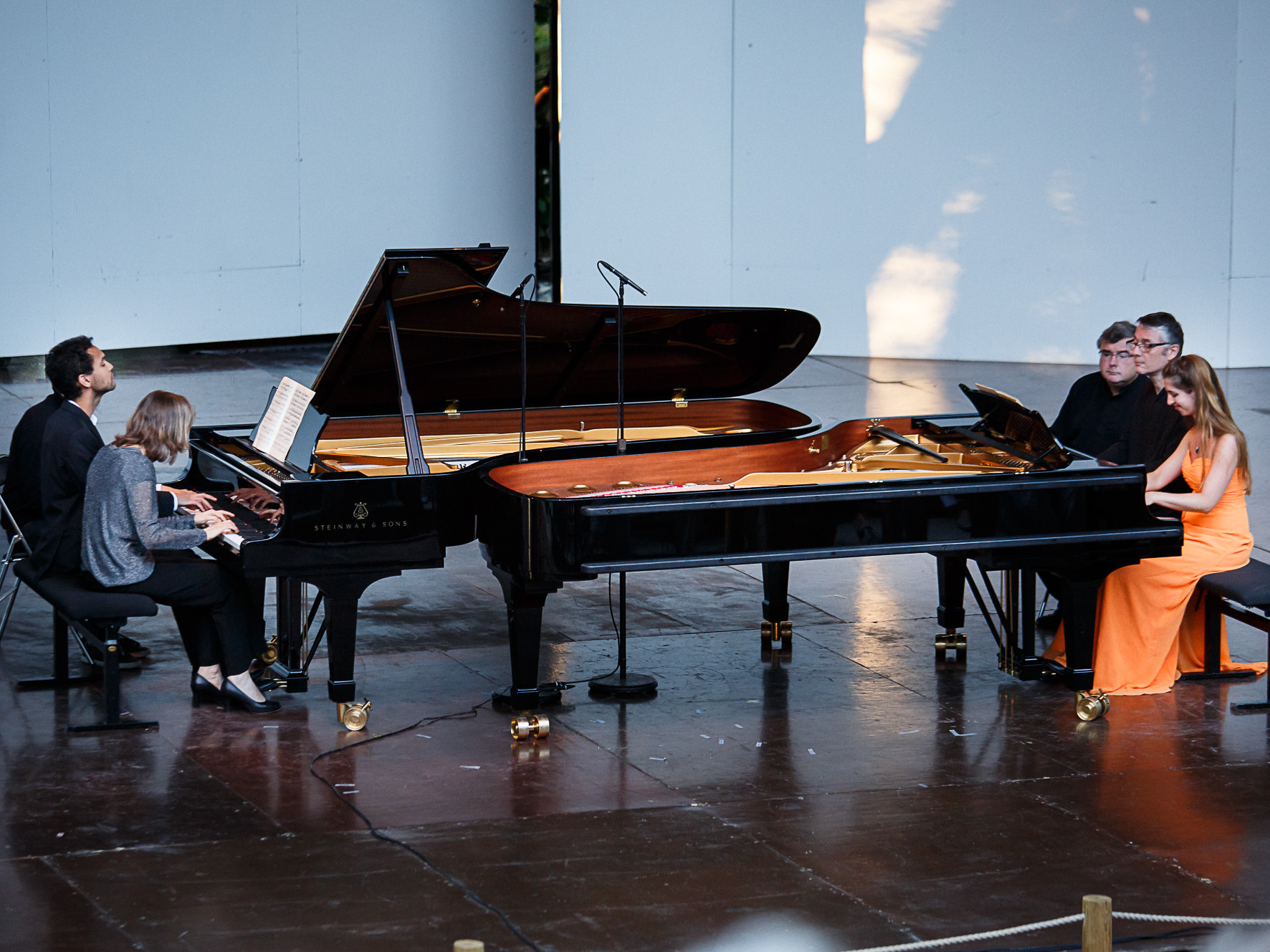 La deuxième partie s'ouvre avec España de Chabrier, pour deux pianos à huit mains (C. Ivaldi, V. Coq, F. Mato et V. Adragna), joué avec vivacité et dynamisme. Puis, le Quatuor Hemera propose l'« Adagio » et le finale du Quatuor n° 1 de Fauré. Les frémissements des feuilles d'arbres balayées par un vent qui souffle parfois fort, ne lui permettent pas de faire entendre toutes ses qualités dans cette œuvre délicate (comme Schubert par Trio Hélianthème dans la première partie). Ainsi, on dénote un certain problème d'équilibre entre les instruments au premier mouvement. Suivent Irène Duval et Aurélien Pascal dans Duo pour violon et violoncelle opus 7 de Kodály, plus que réussi notamment par leur implication dans la musique. L'Ensemble Messiaen exécute des extraits du Trio pour piano et cordes n° 4 « Dumky » de Dvořák avec beaucoup d'application et style. Les trois musiciens constituent un ensemble fascinant et nous avons hâte de les entendre dans d'autres répertoires. Le concert clôt sur le premier mouvement de l'Octuor de Mendelssohn (J.-M. Phillips-Varjabédian, R. Grimbert-Barré, J. Dussap, R. Moreau, L. Hovestadt, G. Le fait, A. Legasa, J. Billet). Il est dommage que le tempo ne soit pas toujours fixe et on remarque ça et là des précipitations, créant parfois un décalage assez important entre les pupitres. A quoi s'ajoute le manque d'homogénéité dans la sonorité : les violons sont « aigres » tandis que les altos sont assez secs, et les violoncelles, plutôt « enveloppants ». Espérons que ces défauts sont en grande partie imputables aux conditions du plein air.