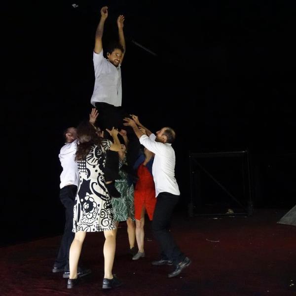 Main dans la main, les danseurs reprennent leur farandole articulée, montant, descendant, serpentant sur les planches, se jetant finalement un à un dans le vide du haut de la dernière planche, côté cour, quand le collectif n'est plus assez large, semble-t-il, pour tolérer l'individuel.