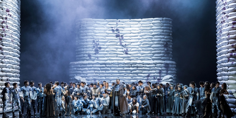 Sans véritable direction d'acteurs, la banale mise en scène de Walter Sutcliffe déçoit. Devant de hauts murs érigés par un improbable entassement de sacs de sable, une armée de soldats en treillis bleus sanglés dans d'étonnants uniformes, des santiags au pied, exécutent un ballet de gestes saccadés à l'indéchiffrable signification. Ils attendent le retour d'Otello, leur chef. Instant choral étourdissant avec le Chœur du Teatro Regio, superbe, développant sa puissance comme s'il devait repousser le tsunami orchestral qui émane de l'orchestre.