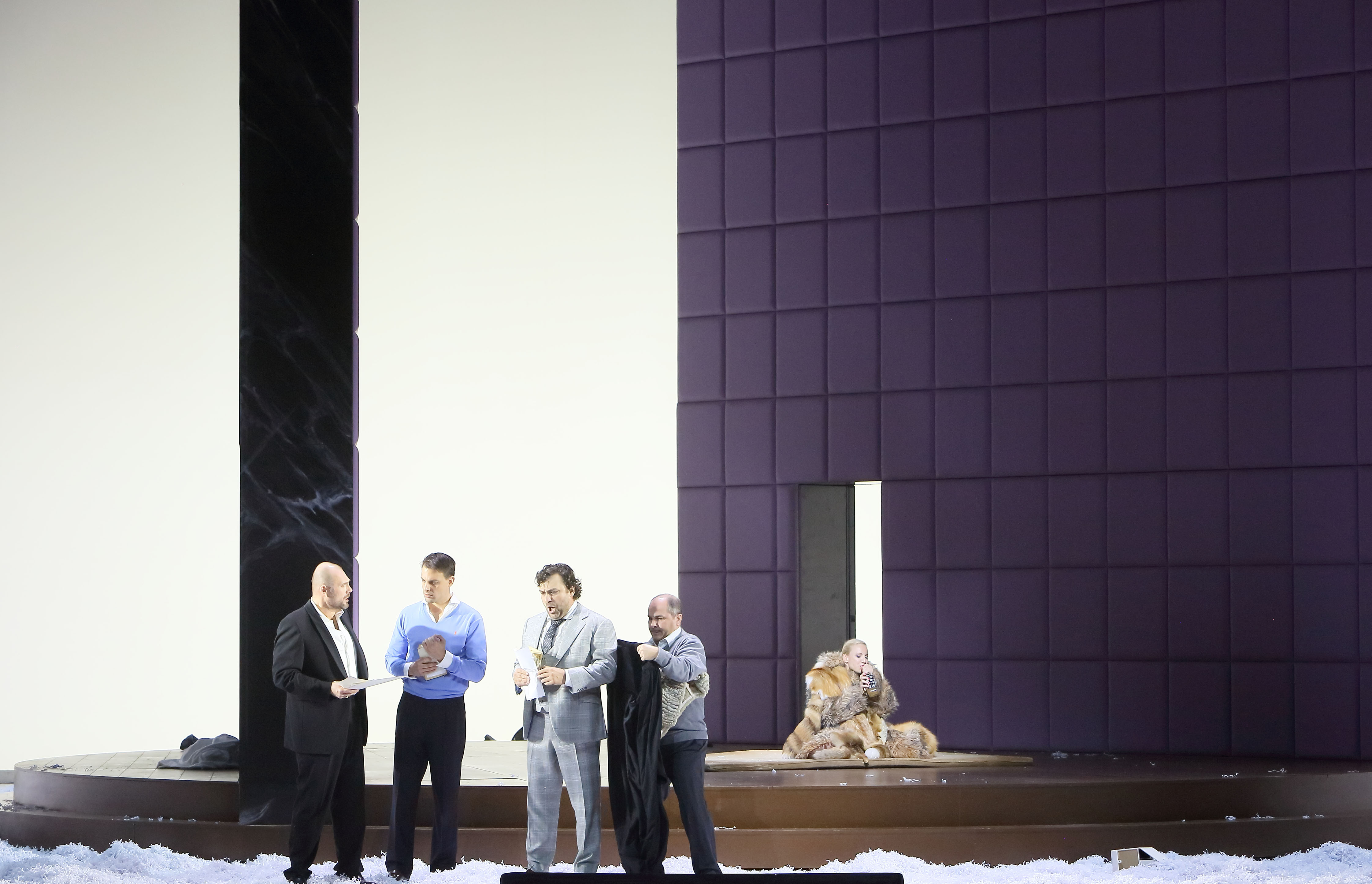 Quelques années après une Jenůfa scéniquement modeste mais gâtée par ses distributions successives, l'Opéra de Munich offre un autre chef-d'oeuvre de Janáček à son public, dans le cadre d'une saison où le XXe siècle est présent en majesté. Cette fois, la mise en scène est à la hauteur de l'enjeu : la comédie de Čapek est si touffue que le metteur en scène a déjà fort à faire à en restituer l'essentiel ; si le travail d'Árpád Schilling ne peut vraiment rivaliser avec la fantastique machine à fantasmes de Krzysztof Warlikowski à Paris, il réalise un spectacle clair, esthétiquement élégant et offrant une direction d'acteurs vivante et soignée. La manière dont sont à la fois distingués et harmonisés les personnages de tous ces hommes qui tournent autour de l'héroïne, tous si vivants, si persuadés de leur individualité mais si désespérément interchangeables, est de ces détails qui n'offrent peut-être pas de perspective nouvelle, mais sont d'une grande aide pour restituer à un public peu familier de l'œuvre les enjeux essentiels de cette ébouriffante comédie.