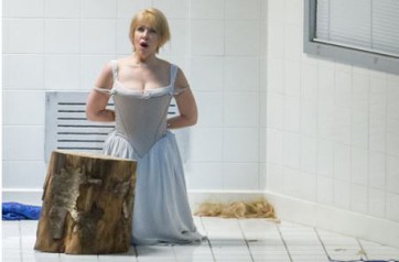 Le problème est moins le manque d'idées que l'épaisseur des cordes, à commencer par cette dispensable décapitation Grand-Guignol pendant l'ouverture ou le fait de souligner l'opposition Elisabeth-Mary en les montrant en costumes « historiques » entourés de personnages en vêtements contemporains. D'autres détails cultivent l'ambigüité, comme cette perruque amovible révélant l'incongrue calvitie de cette reine d'Angleterre haranguant son peuple du haut de son pupitre façon conférence de presse à la Maison Blanche. Doit-on y voir le détail sordide de la perruque de Mary Stuard que le bourreau ivre tentait d'agripper pour exhiber sa tête juste après l'exécution ? La scénographie joue explicitement la carte du sadisme pathologique, en donnant de l'épaisseur à l'improbabilité historique de cette rencontre entre les deux femmes. Cette hache (imposante !) qui passe des mains de Cecil à celles d'Elisabeth, symbole muet de la pulsion de meurtre, ou bien ces restes de repas qu'elle jette à sa rivale agenouillée comme pour l'humilier davantage… la lisibilité des intentions ne demande guère d'efforts. On se rabattra volontiers sur la scène finale, où la cruauté se combine au sordide par une direction d'acteurs très statique et un décor glaçant de salle d'exécution américaine (décidément !) dans laquelle le billot de bois contraste puissamment avec la propreté aseptisée des carreaux blancs. Le rideau qui se referme met fin à cette forme de voyeurisme dont l'issue est connue de tous les spectateurs.