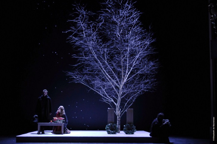 L'hiver symbolise la dernière étape du voyage qu'est toute vie. En toute logique, Yoshi Oida opte pour un visuel très dépouillé, une sorte de Haïku scénique : devant un sobre cyclorama, posé sur un sol noir de jais, un plateau rectangulaire recouvert des stries d'une immense toile grise est planté d'un unique bouleau dépouillé. Dans ce cadre idéal une femme s'installe sur un banc. Un vieillard lui remet un volume rouge qu'elle ouvre. La musique peut démarrer. On comprend assez vite que le jeune homme qui chante le sublime « Gute Nacht » est le donateur du manuscrit, sur lequel on le verra écrire, qui sera ouvert, refermé, passera entre toutes les mains. Il est le Poète. Elle est peut-être l'Amie, la Muse, l'Amante…Un deuxième homme, plus âgé, est de toute évidence le Passeur, le Leierman qui in fine conduira le poète dans le noir de la coulisse.