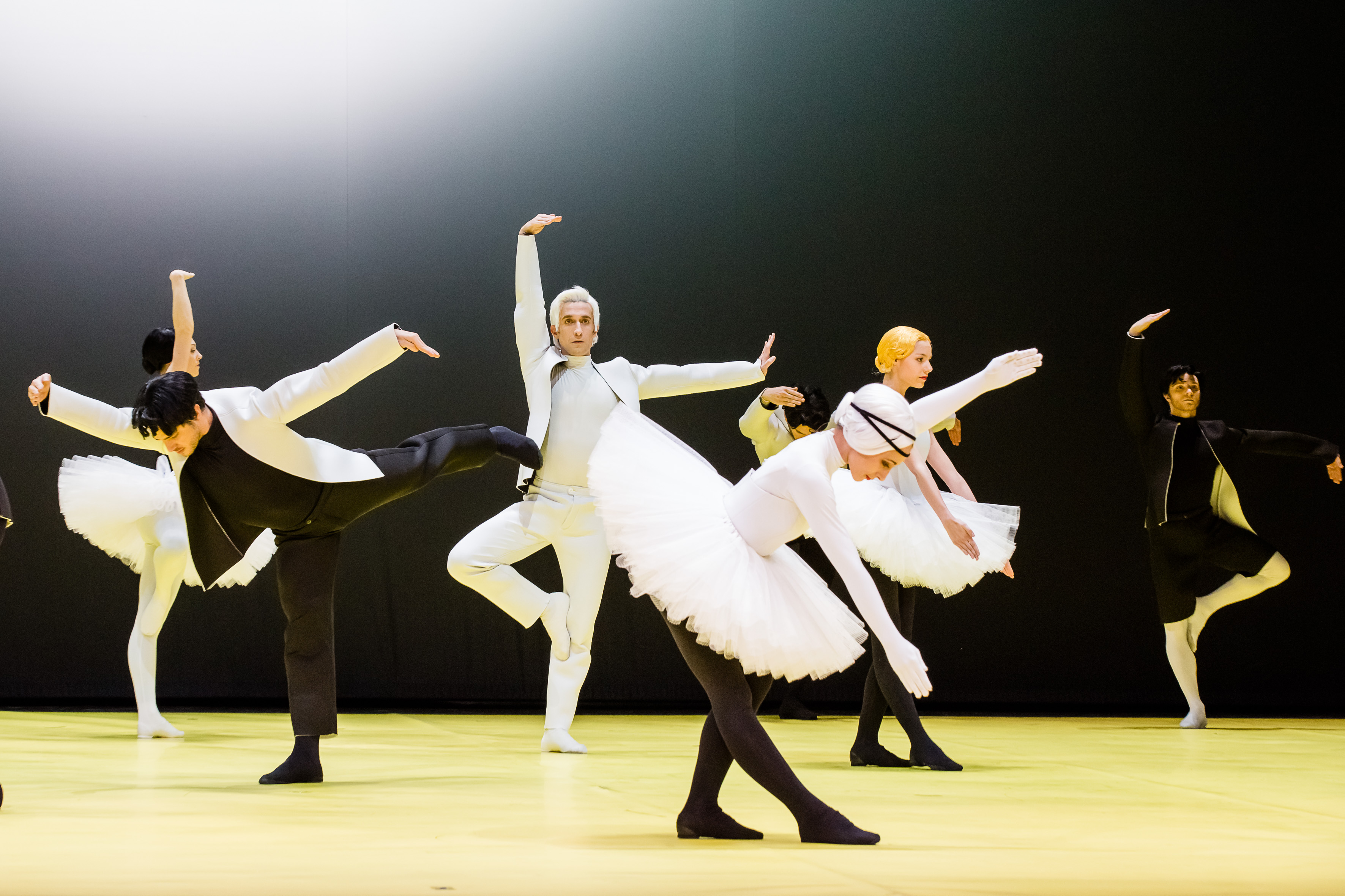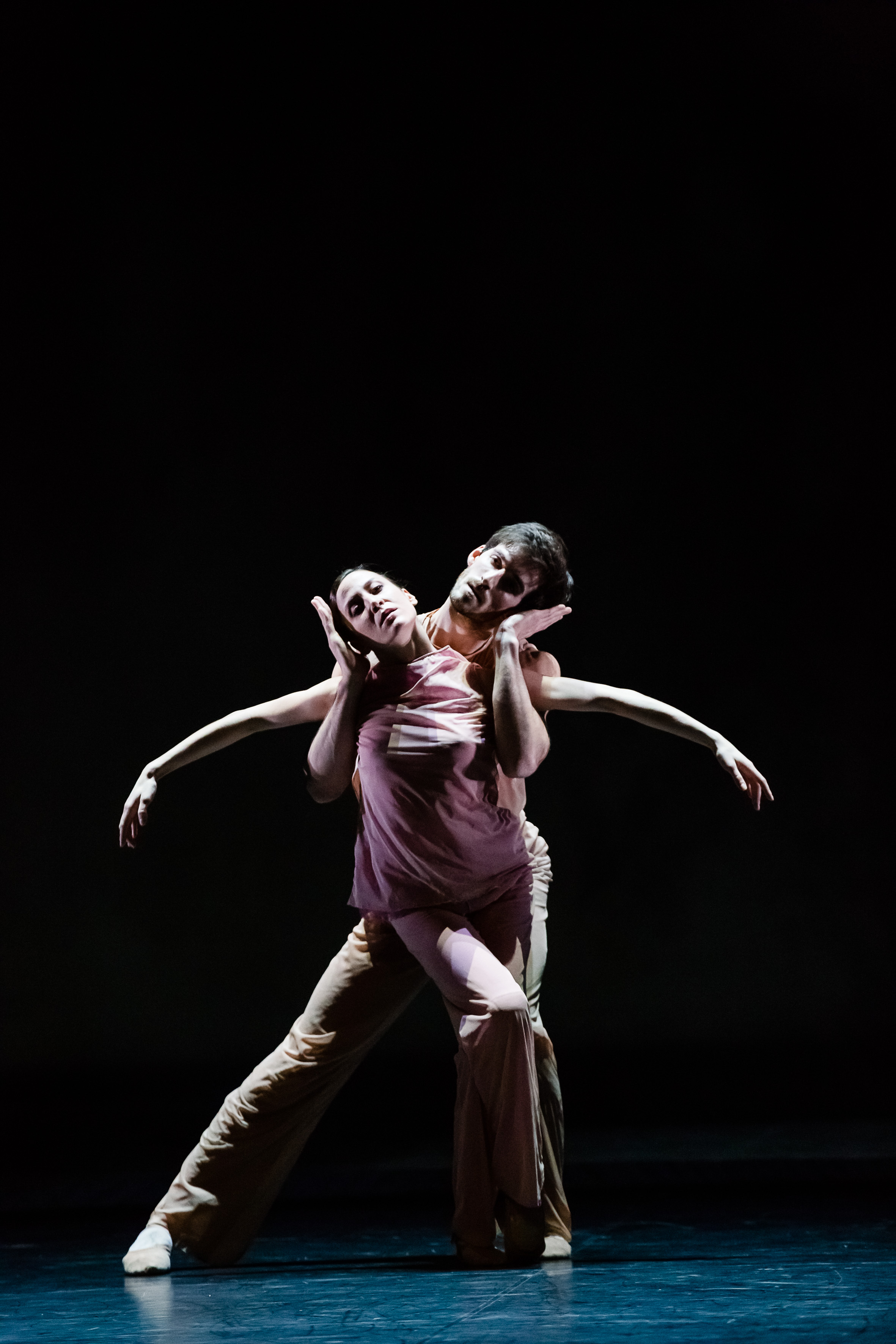La soirée commence par Répliques, une chorégraphie introspective de Nicolas Paul, créée en 2009 pour le Ballet de l'Opéra de Paris. Les répliques, échos lointains d'un séisme ou ricochets d'un galet lancé sur l'eau, ce sont aussi les reflets des danseurs et leurs doubles dans un miroir fictif. Subtils, Ludmila Pagliero et Vincent Chaillet, Aurélien Houette et Valentine Colasante, évoluent avec intensité croissante sur la musique de Ligeti. La profondeur vient au fil des tableaux, rythmés par les toiles peintes abstraites en noir et blanc de Paul Andreu. A l'avant-scène, un galet de bronze aux contours lisses attend sagement, à l'image de la pièce.