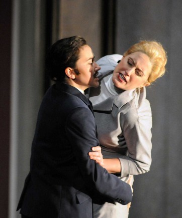 La Clémence de Titus, un opéra politique ? Très certainement. Mais la force de la démonstration n'a rien d'aride ou de contraint. Dès l'ouverture, le plateau tournant dévoile toutes les facettes du magnifique décor de Julia Müer et présente les protagonistes du drame dans leurs univers respectifs. Titus renonce pour raison d'état à son amour pour Bérénice dans une salle aux parois de marbre noir, froide et écrasante, qui révèle sa solitude et où prendront place toutes les cérémonies officielles. Vitellia accueille Sesto dans son bureau high-tech dominé par les bustes de toutes les gloires passées de l'Italie tandis qu'Annio et Servilia abritent leurs amours sur une terrasse arborée. Extrêmement détaillée, la direction d'acteurs de Katharina Thoma abonde en détails justes et réalistes, qui dessinent avec précision des caractères d'une très humaine richesse et complexité. Il se passe toujours quelque chose sur scène, qui vient réveiller l'intérêt ou suscite le questionnement, y compris durant les longs monologues que constituent les airs. Enfin, l'usage virtuose du plateau tournant assure des transitions entre les scènes d'une parfaite fluidité et enrichit avec naturel les interactions.