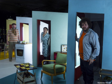 Installé à jardin, Vincent Leterme est un véritable homme orchestre, omniprésent avec ses quatre claviers (piano droit, piano jouet, célesta, synthétiseur) et ses petites percussions. Il règle le défilement des cent « brèves », les ponctuant systématiquement d'un petit tour de crécelle. Les stratégies abondent dans la partition de Bruno Gillet pour moduler le temps de la parole, diversifier les comportements vocaux et instiller une musique, « discrète et modeste », dans l'univers théâtral. Le texte est parfois entendu dans le silence, ou plus souvent souligné par quelques tenues suggestives (l'accordéon), quelques motifs en boucles (le violon, la guitare) et autres petits fredons et rengaines très elliptiques du piano, façon mélodrame. Les personnages ne chantent vraiment qu'à quatre, voix collective par laquelle passe toujours le texte en en suspendant le temps… ou en le resserrant quand il s'agit de donner des recettes de cuisine ralliant tout notre petit monde. La performance des quatre comédiens-chanteurs, Paul-Alexandre Dubois, Christophe Crapez, Edwige Bourdy et Eléonore Pancrazi est éblouissante, qui laisse toujours poindre l'humour en filigrane. Celle des quatre musiciens ne l'est pas moins, donnant à entendre une musique à l'exacte mesure de cette tragi-comédie domestique autant que poétique.