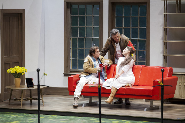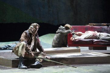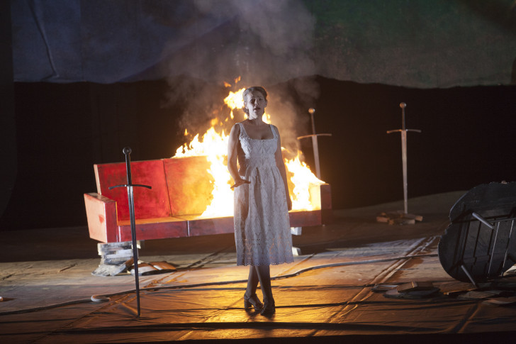 Reste la déception de la mise en scène. Pour unique décor une toile peinte représentant la colline de Glastonbury et qui se dégradera au fur et à mesure de la représentation, image naïve des idéaux d'Arthus. Sinon, deux pans de murs d'un mobil home entourés d'un cercle d'épées fichées dans la terre symbolisant la table ronde seront posés au premier acte pour s'effondrer au troisième, tandis qu'un hideux canapé rouge façon années 60 finira par brûler au grand soulagement du public. Dans cette absence de décor triste et glauque, les hommes vont et viennent habillés comme des ouvriers de chantier (certains ont même quelques casques) et les femmes dans des robes aux couleurs criardes, hormis Genièvre pieds nus en chemise de nuit la plupart du temps. Mais de cette « transposition » tellement éculée ne naît jamais aucune image marquante, juste le malaise à la pensée que les années passées par le compositeur sur sa partition et son livret sont ainsi méprisées par le metteur en scène. La lecture du texte de Graham Vick qui figure dans le programme nous conforte; il eût mieux valu plus d'humilité et de fidélité à Chausson que cette « traduction » qui suscite parfois quelques rires déplacés du public. Dommage, une aussi somptueuse exécution musicale d'une oeuvre aussi rare méritait mieux.