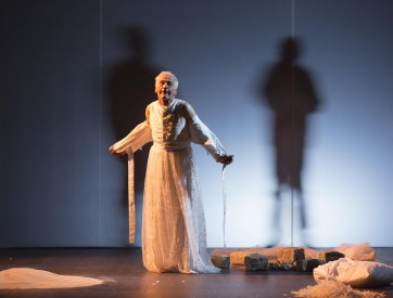 Le décor lapidaire est relayé par les lumières et la vidéo live, celle de Yann Chapotel: les plumes blanches de l'oreiller qu'Elsa est en train de vider sont poétiquement réfléchies sur l'écran comme les quelques pierres que manipule l'acteur alors que l'image fulgurante du cygne surgit à l'acmé de la folie.