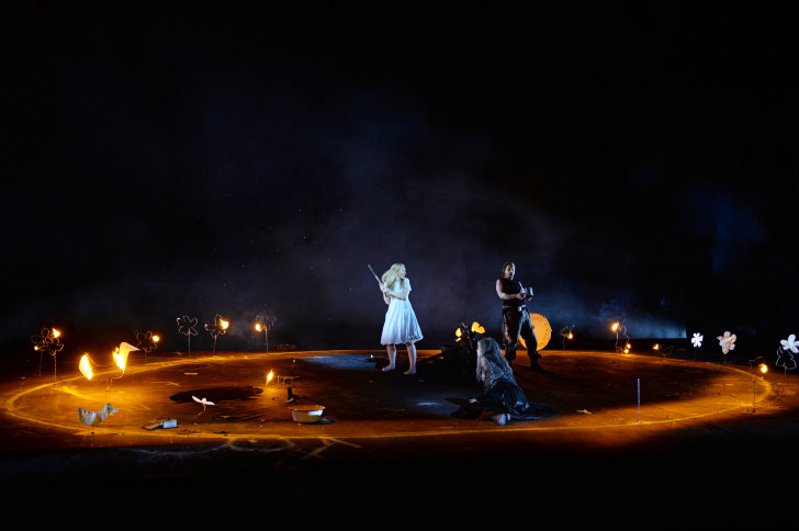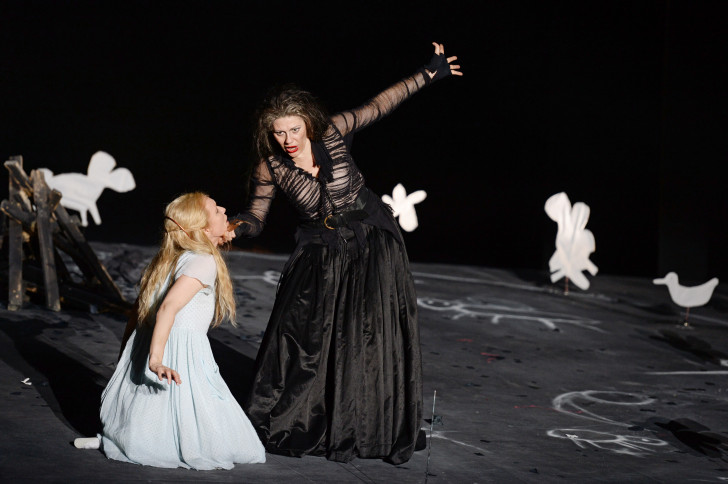 La production reprise ce soir à Francfort a choisi de ne pas gommer l'aspect féérique : la couronne du jeune prince est là, la sorcière a tout d'une vraie, mais, contrairement à la production colorée d'Andreas Homoki à Munich, elle donne à l'ensemble une couleur unique, ce noir qui est en quelque sorte la marque de fabrique des décors que réalise, cette fois sans vidéo, Patrick Bannwart pour David Bösch : ce noir n'est pas sinistre, il est au contraire le support de tous les rêves, de toutes les craintes, entre dessins enfantins et ciel étoilé. Un tel opéra, où le monde de l'enfance est essentiel, est fait pour cette équipe, qui travaille avec bonheur cet âge ambigu entre l'enfance et l'âge adulte (on se souvent de leur admirable Mitridate à Munich). Ici, le travail va peut-être un peu moins loin que d'habitude, les personnages sont dessinés avec moins de tendresse et d'attention, le noir moins vibrant d'émotions que dans d'autres de leurs travaux, mais elle est suffisamment soignée et intelligente pour faire prendre conscience au public des qualités immenses de l'œuvre présentée.
