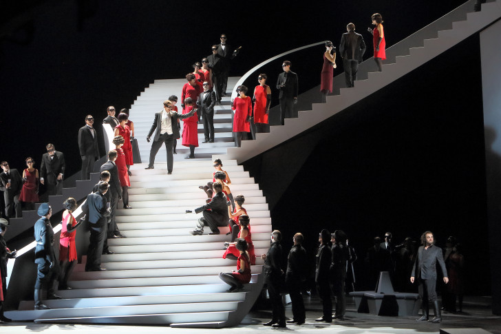 Le décorateur Mathias Fischer-Dieskau place au centre de la scène un gigantesque escalier, qui prend diverses formes au fil des actes : quelques indications du livret indiquent un escalier et, comme dans la production de Peter Mussbach à Paris et Londres, cela suffit à fonder toute une mise en scène. Ici, l'escalier et tout ce qui l'entoure sont situés dans les années 1930, quand le livret parle des années 1860 : ce n'est pas gênant, mais c'est un peu arbitraire. Mais n'y a-t-il que des escaliers dans cet opéra ? N'y aurait-il pas, par exemple, un jeu d'une étonnante perversité avec le genre ? Hofmannsthal place dans la bouche de ses personnages féminins des répliques d'un sexisme vertigineux (quel plus beau sort pour une femme que de servir son époux ?), mais la manière dont Arabella ne se résigne pas à la solution de facilité consistant à épouser l'un ou l'autre de ses riches soupirants, et plus encore les troubles de l'identité sexuelle que Zdenka, l'opprimée, exprime, permettent une lecture plus moderne de l'œuvre : fausse adresse, hélas, dans le travail de Dresen. On ne peut nier que l'ensemble est joli, que la direction d'acteurs est soignée – ce qui n'est pas si mal en comparaison de bien des mises en scène « traditionnelles » façon Nicolas Joel ou Peter Stein –, mais il faudrait un peu plus que cela pour justifier la présence à la scène de cet opéra, qui souffre déjà tellement de son livret impossible.