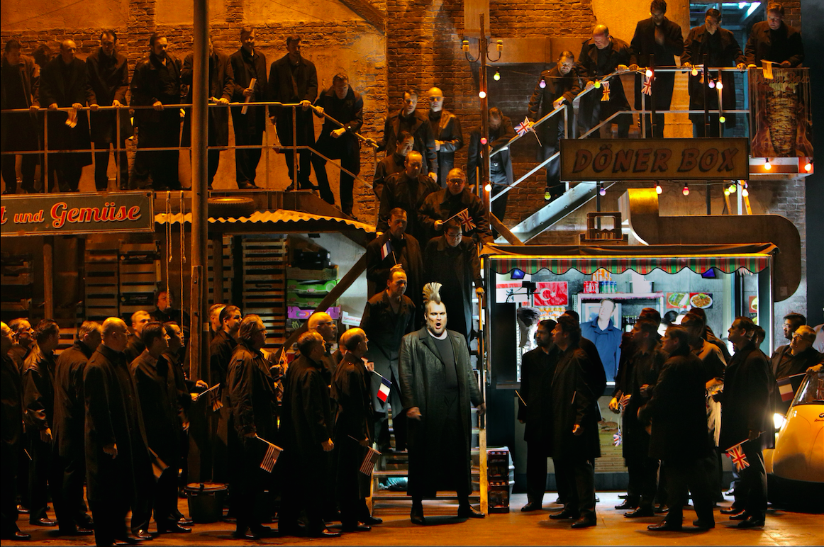 Présence muette et hautement signifiante, le jeu de l'acteur (et assistant-scénographe) Patric Seibert bouscule la lecture littérale du livret en multipliant des angles alors même qu'on pensait tenir une certitude. L'allusion subliminale à la chute du mur se lit en quelques secondes dans ce drapeau rouge qu'on brandit… tandis qu'on se précipite goulûment sur une banane, symbole de la liberté retrouvée pour les « ossi ». Plus loin, cette allusion au Cuirassé Potemkine lorsqu'il laisse échapper un landau rempli de pommes de terre etc. L'utilisation de la caméra à l'épaule nous fait pénétrer au cœur de cette foule à la joie hilare et servile. Hagen dirige d'une main de fer cette célébration de la réunification ; on oublie le symbole pour s'intéresser aux véritables intentions sous-jacentes. La mort de Siegfried à coups de batte de baseball marque le point d'arrêt d'un parcours lamentable, au cours duquel le héros germanique oscille entre pulsion sexuelle et pourriture morale.
