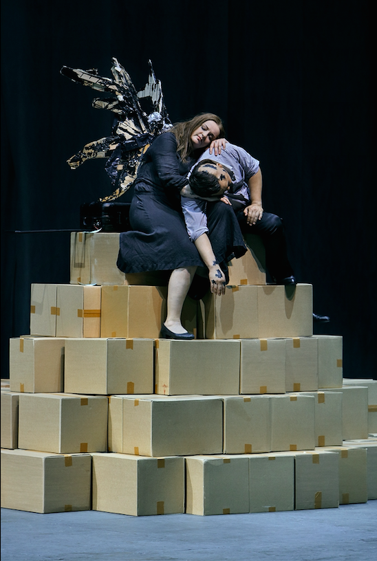 Le pâle Erik ne fait guère le poids avec sa dégaine de magasinier et d'homme à tout faire. Gloger accentue son côté rugueux et peu porté aux réflexions immatérielles. Lorsque Senta se change en victoire néo-romantique avec l'équivalent en carton d'un flambeau et d'une paire d'ailes, elle couronne le Hollandais de la palme de l'éternité. La représentation du couple enlacé au sommet d'une pyramide de cartons fait aussitôt germer dans l'esprit du pilote-chef de projet l'idée de remplacer les ventilateurs par des figurines en plastique des amoureux : le marketing vainqueur de l'amour éternel…