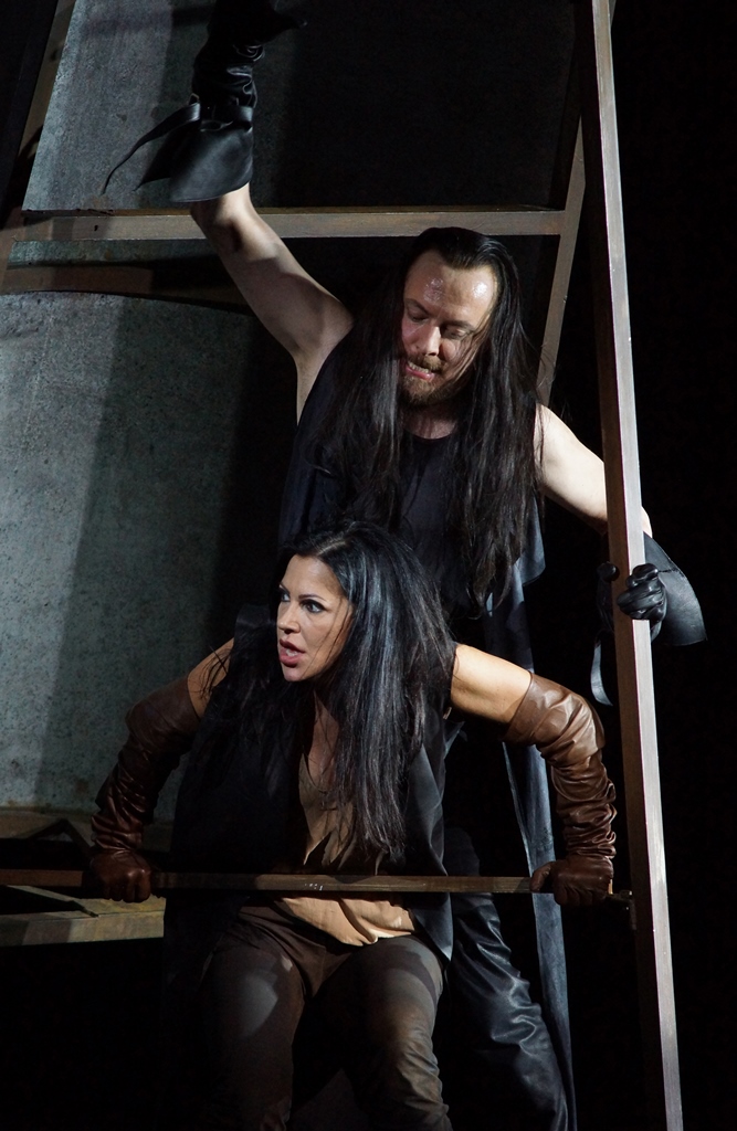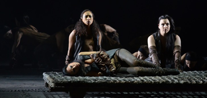 Avec la scénographie de la plasticienne Berlinde De Bruyckere, Pierre Audi signe une mise en scène saisissante où s'exerce l'âpreté d'un monde éminemment sombre, régi par la guerre des corps et une violence quasi bestiale entre les êtres : les personnages en costumes de cuir noir rampent à même le sol au milieu des peaux animales de la plasticienne, suspendues telle une installation, dans les premières scènes de l'opéra. Les lumières de Jean Kalman et la vidéo de Mirjam Devriendt animent l'espace et jouent superbement sur les matière brutes du décor, la peau mais aussi le métal puis la pierre, métaphore du tombeau. Ce qui n'est pas explicité sur scène sera rapporté par le choeur – celui de l'Opéra national du Rhin – dans l'esprit de la Tragédie antique.
