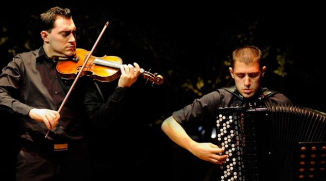 Ensuite, à 14 heures, c'est une véritable révélation : les frères Bouclier, Julien au violon et Dimitri à l'accordéon, qui ont effectué tous deux leurs études musicales en Suisse, jouent en parfaite communion l'un avec l'autre et avec la musique. Dimitri, surtout, est totalement habité, voire « possédé » par la musique, faisant réellement corps avec son instrument ; les mélodies et les harmonies qu'il fait naître sont si naturelles et si profondes que ceux qui l'entendent croiraient même à une incarnation de la Muse, et nos lecteurs peuvent nous faire entièrement confiance quant à cette expression consacrée. Il nous fait connaître une œuvre intitulée Goulag, pour accordéon solo, de Victor Vlasov (né en 1936) qui relate la vie dans un camp en Sibérie. Elle se compose de quatre mouvements : « Arrivée en Sibérie », « Tentative d'évasion », « Travaux forcés » et « Combat quotidien des prisonniers ». Tous poignants, introduisant des bruits de vent et des accords dissonants, mais restant dans le cadre tonal (bi- et polytonal), dont l'interprétation atteint une virtuosité de haute volée et une musicalité hors norme. Toutes les pièces du programme sont arrangées par les soins des deux frères, qui révèlent ainsi leur excellence dans l'art de transcription. Ce sont deux « véritables » musiciens et nous devons nous réjouir qu'une telle combinaison d'instruments, souvent reléguée dans la catégorie de la musique folklorique (et à laquelle on attache une importance moindre par rapport à la musique savante), nous entraîne aussi loin dans l'art musical en nous invitant à un voyage si intense.