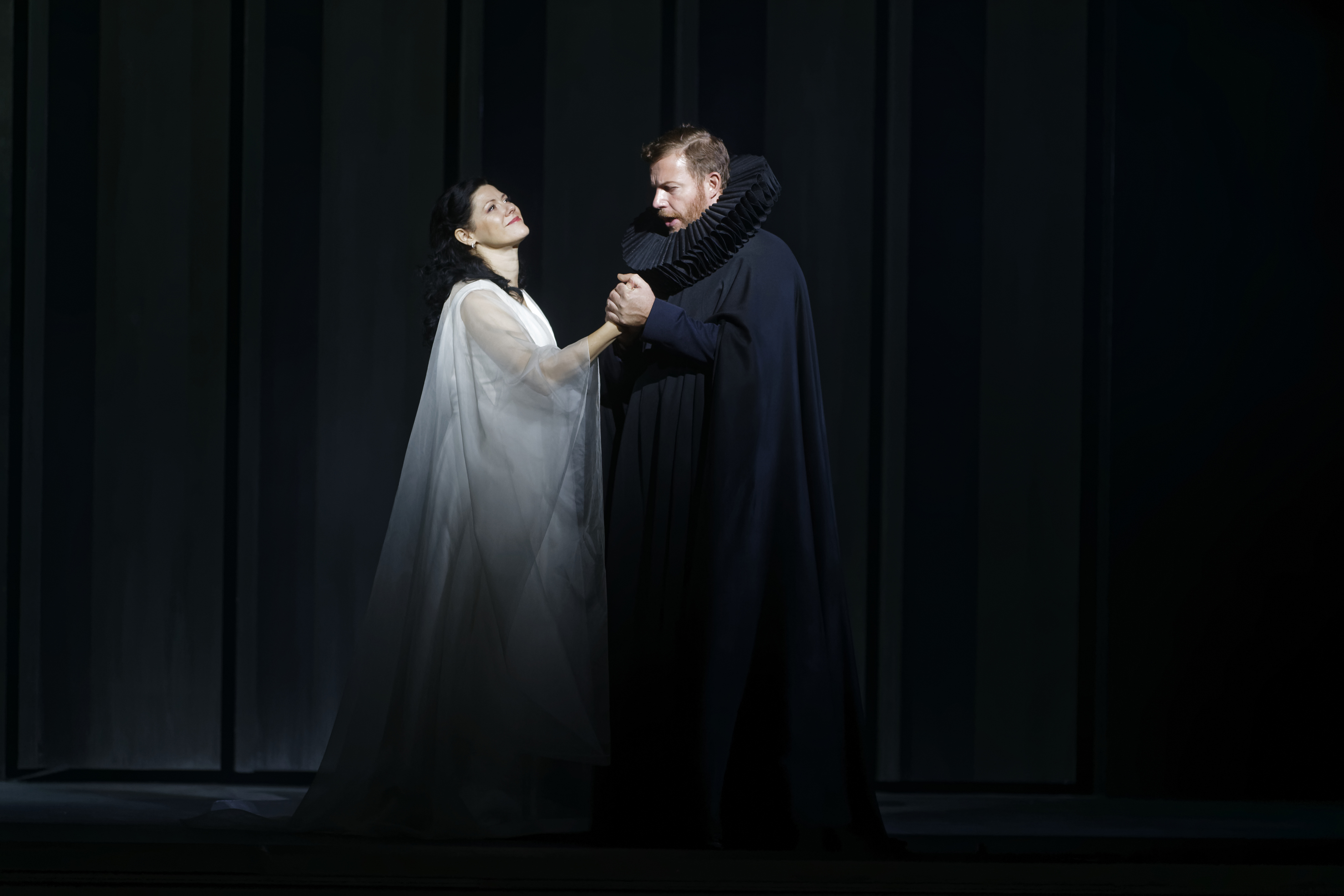 Par un bel effet de correspondance, les cintres abaissés jusqu'au sol servent de liaison visuelle avec le début du Château de Barbe-Bleue. L'actrice Yaëlle Antoine enjambe ces obstacles (comme une préfiguration des obstacles à franchir) et se présente sur le proscénium pour « dire » le prologue de Béla Balázs en langue des signes. Cette originalité retombe rapidement quand apparaissent les sept portes, dans un dispositif de cloisons enchâssées qui pivotent autour d'un axe central représenté par la dernière porte. Le décor sans réelle surprise se double d'un jeu d'acteur réduit au minimum et l'ensemble finit par lasser. Le Barbe-Bleue de Bálint Szabó n'a pas le relief et la caractérisation d'un rôle entre autorité et soumission. Les timbres, assez clairs dans l'aigu, deviennent charbonneux dans le grave et assez atones dans l'ensemble. Tanja Ariane Baumgartner semble plus prudente en abordant le rôle de Judith. Son interprétation gagne progressivement en tension et ce n'est véritablement qu'à la quatrième porte qu'elle offre toute l'étendue de sa palette expressive.