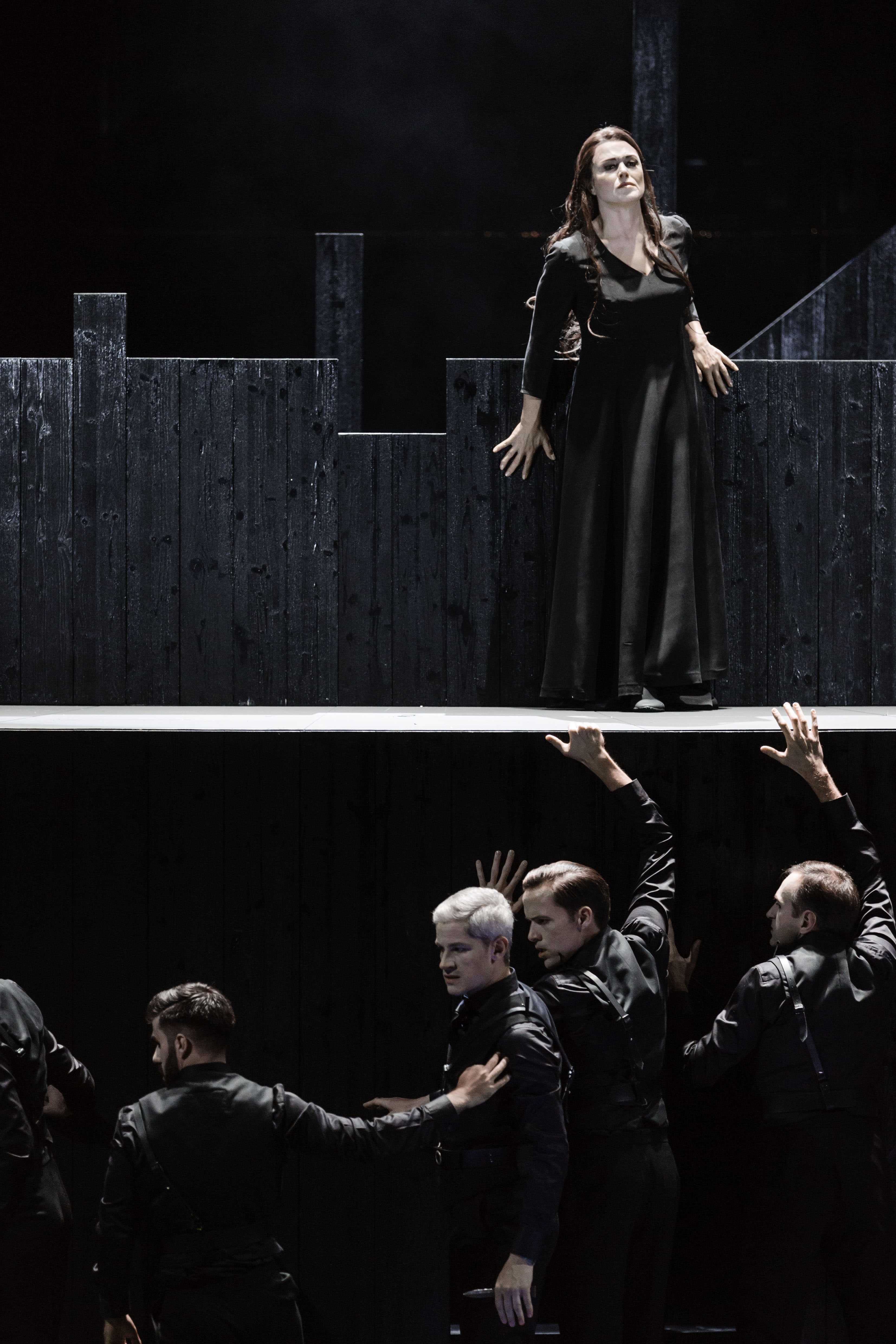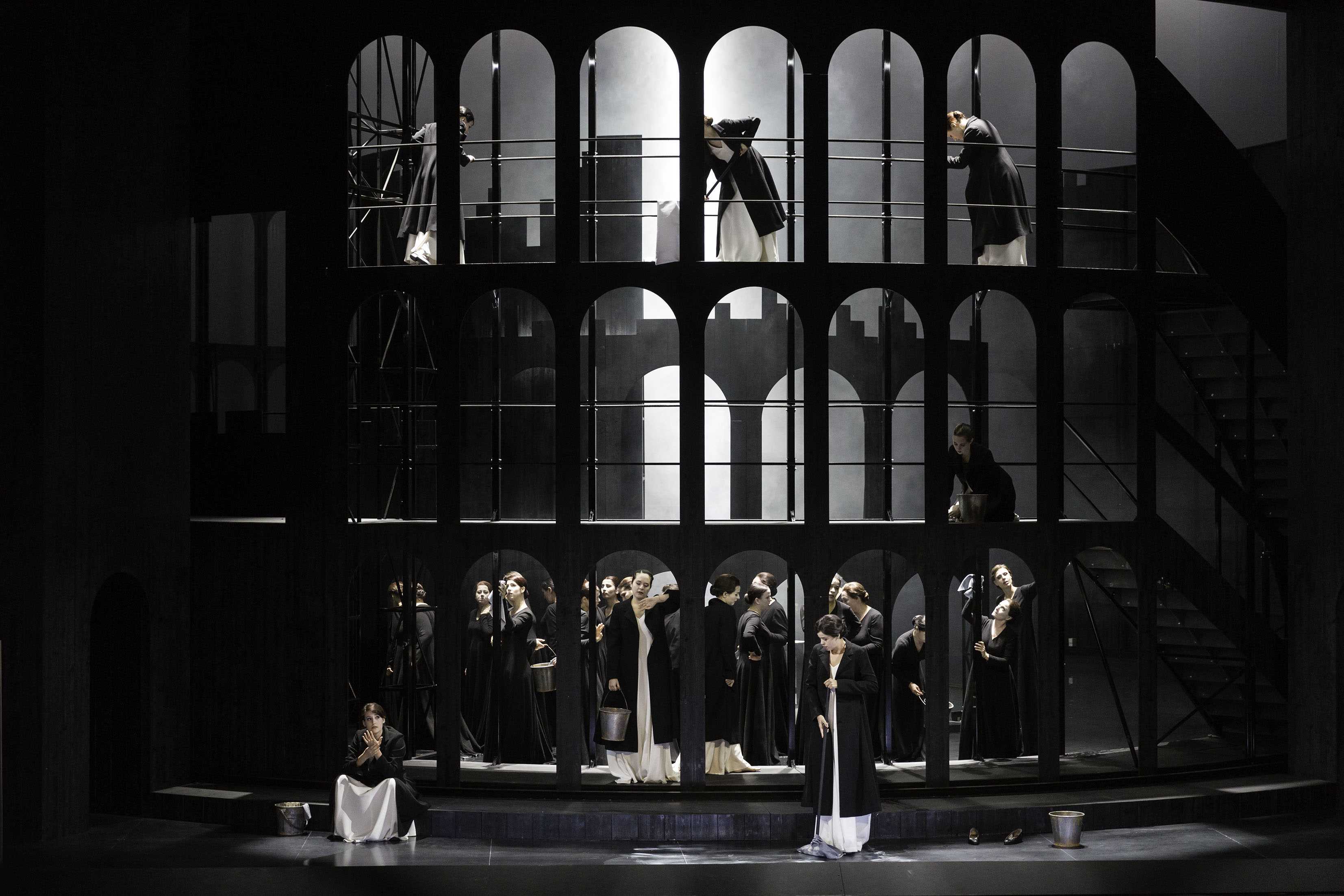 Comme à son habitude, Pierre-André Weitz a conçu une architecture complexe et onirique, faite de deux cylindres noirs emboîtés, qui tient à la fois du château fort aux murs crénelés et du palais renaissance aux galeries d'arcades superposées. Dans ce décor constamment mobile et qui ménage ainsi des perspectives variées, Olivier Py confirme sa science théâtrale tout en déroulant son vocabulaire coutumier, comme avec les corps dénudés de l'orgie des prétendants à l'acte I. Il réintroduit le personnage de Télémaque, absent du livret, Laërte mourrant sur son lit et même le chien Argos, le premier à reconnaître son maître Ulysse. Il n'omet pas de rappeler l'Odyssée qui a précédé, par le biais d'une pantomime à l'arrière-plan ou d'ombres chinoises sur le gigantesque voile que tisse et défait Pénélope nuit après nuit. Et l'eau qui envahit le palais lui permet de magiques effets de reflets et de lumière.