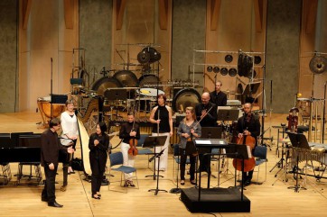Situés à jardin et à cour, ce sont Sébastien Vichard et le même Samuel Favre, au centre d'un dispositif de percussions pléthorique, qui assurent les parties solistes, aux côtés de l'Ensemble Intercontemporain et du chef Tito Ceccherini. La compositrice a placé de petites pièces de métal entre les touches du piano pour fondre les couleurs du clavier préparé à celles de la percussion. Procédant par relais instrumentaux et surimpressions de timbre qui hybrident les sonorités, Unsuk Chin cherche à lier solistes et ensemble en un « corps unique ». L'univers sonore extrêmement foisonnant sollicite l'énergie du geste – celui des solistes est hallucinant – et la cinétique des trajectoires sonores. La tension qui s'en dégage et l'éclat des couleurs sont très impressionnants, relevant d'un savoir faire et d'une virtuosité hors norme. La très belle coda laisse transparaître le côté félin et facétieux d'une écriture toujours finement ciselée.