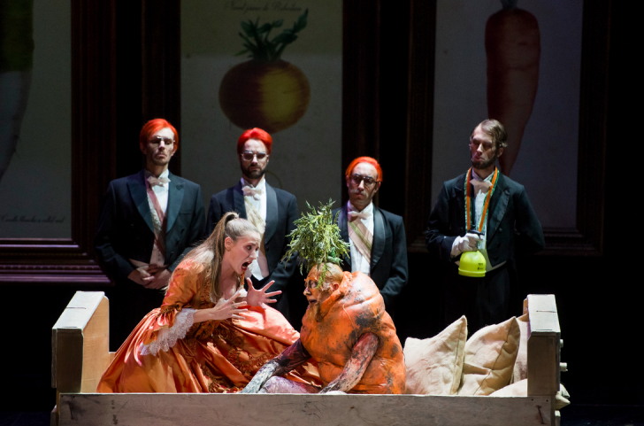 Nous sommes en 1872 et, sur les cendres du Second Empire, ces mauvais farceurs que sont Victorien Sardou et Jacques Offenbach, portent sur les fonds baptismaux cette partition au titre étrange. Le Roi Carotte est une œuvre à tiroir, une farce qui se joue des ciseaux de la censure et dissimule sa subtilité dans des allusions explicites à l'époque… mais qui exigent du spectateur de 2015 une certaine acuité. Entre tubercules, radicelles et radicaux (de gauche et de droite), se cache une savoureuse satire sociale et politique des mœurs post-impériales. La sorcière Coloquinte a juré la perte du roi Fridolin XXIV et fait sortir de terre une carotte maléfique, avec ses acolytes radis. Les costumes sont d'une stupéfiante efficacité, créant une sorte d'effroi hilarant quand ce potager sort de terre au milieu d'une brume digne d'un film d'horreur.