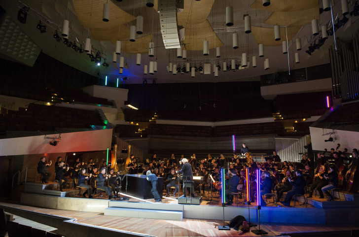 Depuis quelques années, l'Orchestre Philharmonique de Berlin travaille en collaboration avec le metteur en scène Peter Sellars pour des spectacles qui ne sont certes pas pleinement scéniques, mais tirent tout le parti scénique possible des vastes espaces de la Philharmonie.