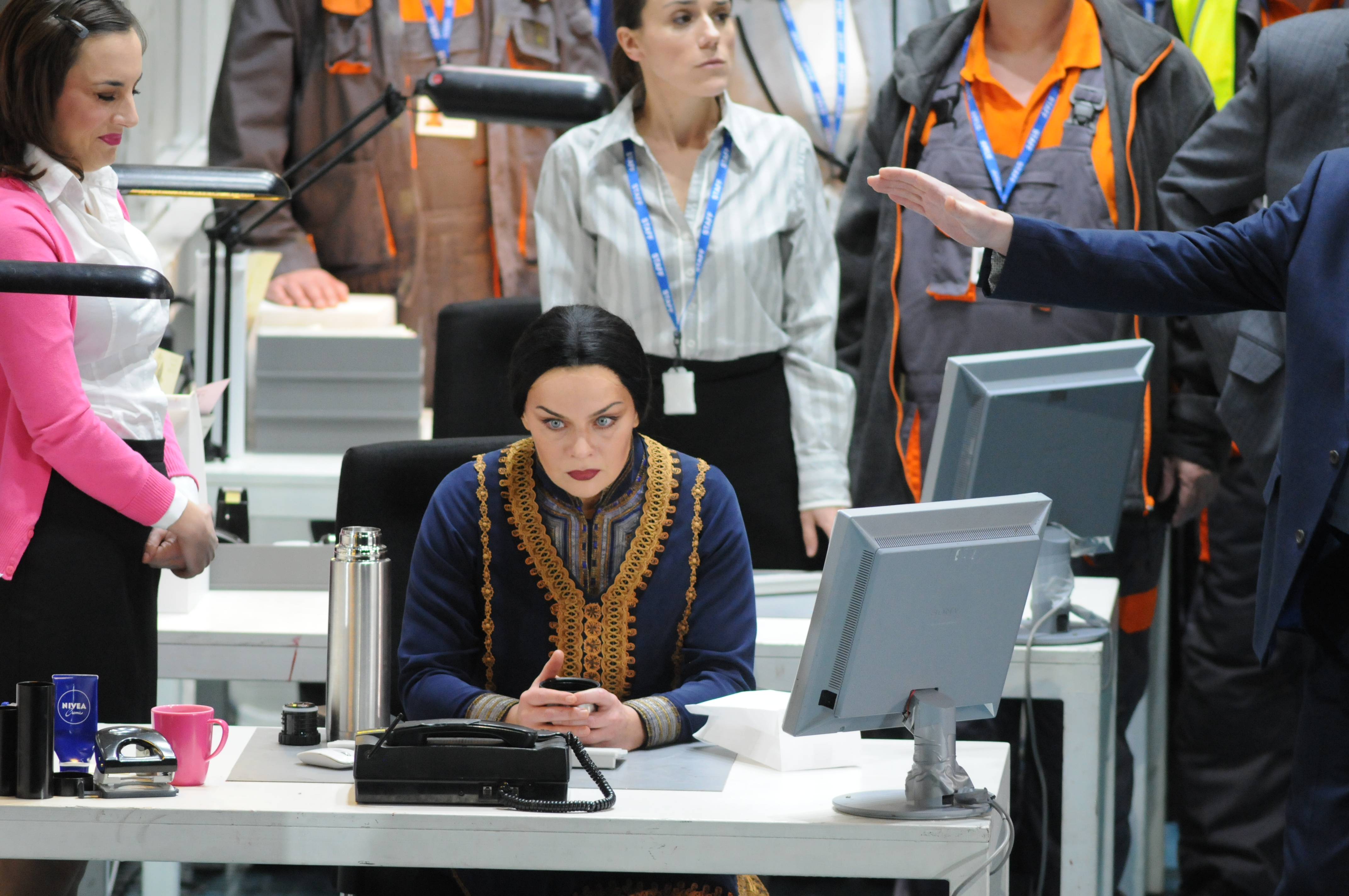 Au premier abord, on pourrait se croire chez Christoph Marthaler ou Jacques Tati : cet intérieur de bureau éclairé par la lumière agressive d'un néon, avec son cortège de laideur contemporaine, entre cloisons en plexiglas, open space et faux plafond. Au centre, une incise écarlate, l'étouffante et secrète alcôve dans laquelle Katerina trône en maîtresse de maison et objet de convoitise sexuelle. Cet espace tient à la fois de l'abstraction et de la projection fantasmatique ; les murs entièrement recouverts de tapis orientaux dont la géométrie des motifs centraux dessine involontairement (?) des auréoles iconiques autour des personnages.