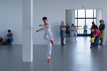 Au sol, de larges cercles tracés à la craie délimitent un vaste espace de jeux et d'expérimentation. Un violon et un alto s'accordent dans un coin, puis se lance dans un duo extrait de Vortex Temporum de . Deux danseurs en blanc sortent de la foule anonyme et emplissent à leur tour l'espace en mouvements. Plongés au cœur d'une scène imaginaire, les spectateurs évitent parfois en pivotant d'un quart de tour l'ample volte des interprètes.