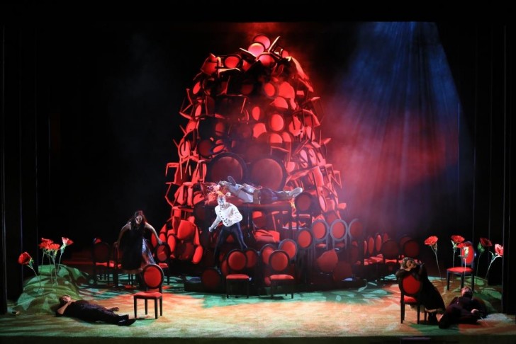 Un amoncellement savamment agencé de chaises rouges, donnant l'apparence du désordre et du chaos, signale les excès et les débordements de la fameuse nuit d'été. Excellente idée que de donner les deux premiers actes, reliés dans l'esprit tout comme ils le sont dans le temps, sans interruption. L'ordre apparemment retrouvé au troisième acte est ici suggéré par l'alignement impeccable des mêmes chaises, surplombées à l'arrière-plan par un temple grec – quelque peu bancal toutefois – qui semble garantir le retour au monde diurne de la sagesse et de la raison. Fort heureusement, la pièce jouée par les artisans vient faire diversion dans cet univers aseptisé, à la froideur presque inquiétante…