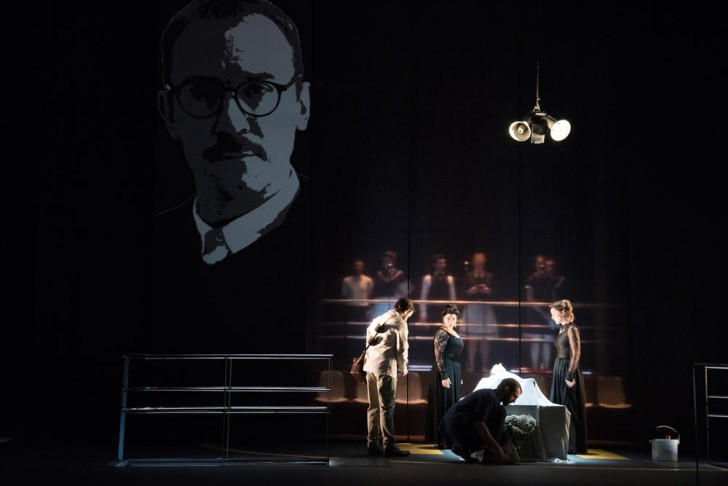 Exceptées les six minutes de silence, interminables et maladroites, qui débutent (très mal) l'opéra, la mise en scène d'Antoine Gindt, fluide et sobre, situe les prémices de ce « voyage » sur le pont d'un bateau, imaginant ensuite pour chaque tableau un espace spécifique à la faveur des éclairages et des rideaux de tulle qui en modifient l'atmosphère. Un portrait géant de Schliemann occupe le fond de scène durant les premiers et derniers tableaux, lorsque le personnage n'est plus de ce monde.
