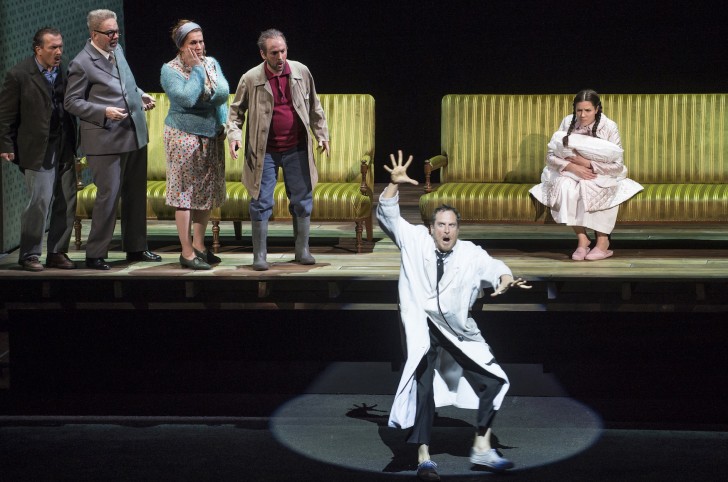 Genève. Opéra des Nations. 4-IV-2016. Charles Gounod (1818-1893). Le Médecin malgé Lui, opéra-comique en trois actes sur un livret de Jules Barbier et Michel Carré d’après la comédie éponyme de Molière. Mise en scène : Laurent Pelly. Décor : Chantal Thomas. Costumes : Jean-Jacques Delmotte. Lumière : Joël Adam. Avec : Franck Leguérinel, Géronte ; Clémence Tilquin, Lucinde ; Stanislas de Barbeyrac, Léandre ; Boris Grappe, Sganarelle ; Alhima Mhamdi, Martine ; Doris Lamprecht, Jacqueline ; José Pazos, Lucas ; Nicolas Carré, Valère ; Romaric Braun, Monsieur Robert. Orchestre de la Suisse Romande, Chœur du Grand Théâtre de Genève (direction Alan Woodbridge). Direction musicale, Sébastien Rouland.