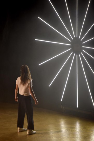 La musique électronique pulsatile, comme étouffée, fait écho à la scénographie plasticienne conçue par le chorégraphe : trois grandes roues de lumière blanche, qui évoquent le travail sur les lieux d'enfermement de l'artiste Laure Tixier. Un dispositif scénique horizontal et frontal qui aurait eu besoin pour s'épanouir de la proximité et de l'intimité d'une boîte noire, dans un rapport scène-salle plus immersif que celui proposé à l'Opéra Comédie de Montpellier pour cette création.