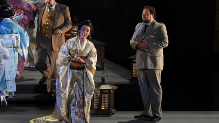 Ermonela Jaho se lance corps et âme dans cette Butterfly prête à renier sa foi et ses ancêtres. Arborant une étonnante robe rose de teenager américaine comme revendication de sa nouvelle identité, elle affronte crânement les bourrasques glacées pour laisser planer de somptueux aigus, culminant sur une ligne de chant très affirmée et volontaire. Bryan Hymel n'a pas en Pinkerton toutes les nuances et la projection nécessaires pour braver le climat et surtout le redoutable espace scénique en plein air. Son personnage est relativement terne, sans que cela ne justifie pour autant le début de bronca qui semble agiter le public aux applaudissements. Marie-Nicole Lemieux est parfaite en Suzuki, d'une projection et d'une incarnation idéales pour exprimer le côté maternel et rassurant. Marc Barrard donne à Sharpless un relief adéquat, tandis que Carlo Bosi est un Goro sonore et contrasté, plus vif que le bonze assez terne de Wojtek Smilek. L'admirable Yamadori de Christophe Gay rejoint la discrète mais remarquable apparition de Valentine Lemercier en Kate Pinkerton.
