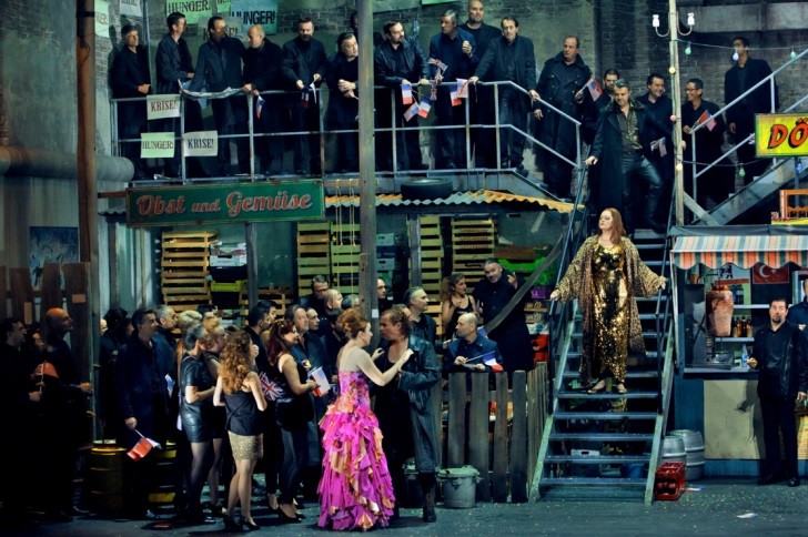 On a envie de voir dans le décor de ce Götterdämmerung par Aleksandar Denić, une forme d'hommage à la célèbre production Chéreau-Peduzzi de 1976. Entre le Berlin décati et lugubre de la division Est-Ouest et l'univers fin XIXe siècle lié à la révolution industrielle, la conclusion du Ring de Wagner résonne d'un écho funèbre et fatal. On observe ici les conséquences politico-économiques d'un monde qui a tout misé sur l'extraction du pétrole comme unique ressource et unique richesse.