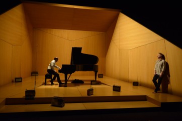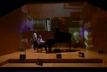 Dans la boîte de bois blond où une très discrète (et trop chiche ?) vidéo fait lentement tournoyer le papier peint de la maison de « Laon dans l'Aisne », Claude Duparfait parle, regarde, dort, écoute, danse, ose (gonflé !) le chant sur la Pavane pour une infante défunte, faisant de ce chef-d'œuvre une ode solaire à la beauté romaine, l'expression même du Syndrome de Stendhal. Dans son entreprise audacieuse, car impudique forcément (le contraire de Maurice Ravel, qui, lui, n'a jamais rien lâché quant à sa vie intime), mais toujours payante, Claude Duparfait n'est pas seul : au centre de la scène, François Dumont, magnifique ravélien (intégrale de l'œuvre pour piano chez Abeille Music à l'appui) l'accompagne à tous les sens du terme, d'un piano tout en rondeur chaleureuse, qui fait défiler Alborada del gracioso, Gaspard de la nuit, La Valse… Le dialogue empathique et vibrant que la délicate Célie Pauthe tisse entre les deux hommes, est d'une subtilité simplissime : la façon dont le pianiste conclut sa musique pour relancer la parole vers l'acteur, d'un regard ascendant et avide de la suite du récit, ainsi que sa totale bienveillance font l'effet d'un baume. La lumière, d'une douceur de miel, caresse les êtres et les choses. Les deux hommes font entendre à la fin le swing de l' incontournable Boléro en installant au sol un aréopage de transistors de toutes tailles : la nostalgie de ces passeports de naguère vers l'indépendance fonctionne alors à plein régime. Puis la lumière tombe : le voyage magnifique s'achève… L'on regrette tout juste que la metteuse en scène n'ait pas envie de garder plus longtemps sous la rétine l'image de ces deux hommes face à face, enfin poétiquement transformés en silhouettes noires…