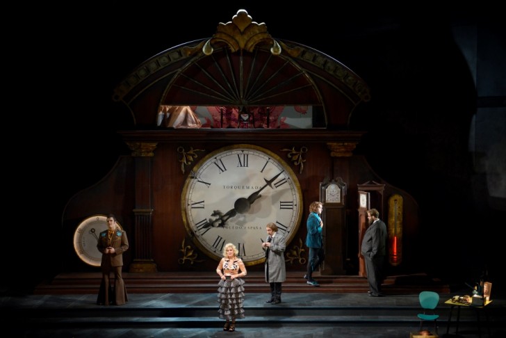 Particulièrement astucieuse, la mise en scène de Bruno Ravella se plaît à tisser des liens entre deux œuvres conçues à la même époque, toutes deux ressortissant du registre du comique mais d'esprit et de tonalité radicalement différents. On voit mal en effet, de prime abord, ce qui peut relier le subtil marivaudage de Ravel, plein de sous-entendus volontiers grivois, à la farce de Puccini, encore toute empreinte des conventions et de l'esprit de la commedia dell'arte. Autant Gianni Schicchi est imprégné de références à la ville de Florence – superbe vue sur le Duomo en toute fin de spectacle –, autant L'Heure espagnole est marquée de renvois à Tolède, au Guadalquivir, à l'Estrémadure et à tous les clichés associés au monde ibérique. Si l'ouvrage de Ravel raconte les déboires d'un ménage aux prises avec les épreuves du temps, celui de Puccini n'évoque qu'en filigrane les amours juvéniles de Lauretta et de Rinuccio, pourtant les grands triomphateurs au final du stratagème ourdi par Schicchi. C'est donc un élément scénique fort, adapté aux nécessités et aux spécificités de l'action, qui va unir les deux ouvrages pratiquement contemporains, reliés ici par la présence monumentale d'une immense horloge permettant de signifier aussi bien le passage de la fameuse heure « espagnole » chez Ravel que l'arrêt du temps, avec la mort de Buoso Donati, chez Puccini. Dans L'Heure espagnole, l'essentiel de l'action est donc situé à l'intérieur de l'horloge, notamment dans la partie supérieure censée représenter l'intérieur de la chambre de Concepción ; les ébats qui s'y déroulent – ou plutôt qui ne s'y déroulent pas, au grand dam de la dame… – sont suggérés par l'espace tronqué que laisse entrevoir le fronton de l'horloge, légèrement soulevé. Dans Gianni Schicchi, la pendule à l'arrêt est remisée sur le côté de la scène, mais elle reste un élément central dans la chambre du défunt. À la fin de l'acte, elle figurera le clocher d'où les jeunes amants contemplent la superbe vue sur Florence. C'est ainsi dans ces deux ingénieux décors, situés respectivement dans les années 1940 et 1980, qu'évoluent de jeunes et brillants acteurs, dont le jeu parfaitement rôdé irait presque jusqu'à évoquer cette mécanique parfaitement huilée, autant pour le batifolage de Concepción et de ses quatre soupirants que pour les agissements crapuleux de la famille et des connaissances de Buoso Donati. La mise en scène, pour les deux ouvrages, fourmille d'idées et de gags à la grande joie d'un public conquis dès les premiers instants de la soirée.