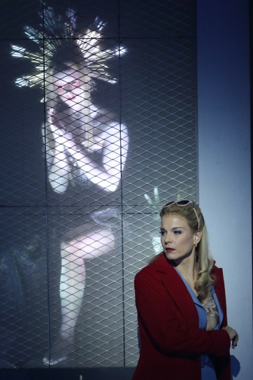 Contrairement à La Juive, qui bénéficie d'un faux renom d'actualité du fait de son sujet, La Favorite n'a pas été confiée à un grand nom de la mise en scène lyrique. Le dilettantisme malhabile des librettistes en est sans doute la raison : est-il possible de trouver des excuses à tant de maladresse ? Amélie Niermeyer est une metteuse en scène expérimentée, sur la scène théâtrale plus qu'à l'opéra, et son travail ne manque pas de probité. Dans un décor de hauts modules constamment réagencés, elle règle les allées et venues avec soin, et, dans une direction d'acteurs raisonnablement efficace, elle parvient même à donner corps au seul personnage que le livret autorise un peu à vivre, celui de Léonor : aidée par la distinction naturelle de son interprète, elle souligne à quel point elle est étrangère au rôle indigne qu'on lui fait jouer, et on voit à chaque instant cette douleur sourde en elle – rendant ainsi d'autant plus brutale et artificielle l'agression verbale qu'elle subit de la part de Balthazar, que le reste du livret dépeint comme un saint homme, mais qui se distingue dans le final du deuxième par le zèle avec lequel il accable la victime plutôt que le coupable.