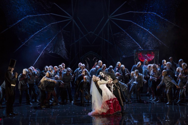 Dans un délire de sang et de lambeaux de chair virevoltants, le Grand-Guignol cher à nos ancêtres envahit la scène du Théâtre des Nations. La première scène (l'ouverture a été coupée, une spécialité du metteur en scène qui avait déjà fait de même dans sa première mise en scène d'opéra avec Guillaume Tell de Rossini à Munich en 2014 !) voit Lord Ruthven s'avancer à grands pas sur un praticable entourant la fosse d'orchestre et s'emparer d'une spectatrice du premier rang par les cheveux qui, hurlant se voit éventrée par l'effrayant personnage. Lui fouillant les entrailles, il en sort un amas de boyaux sanguinolents qu'il brandit en poussant un rire satanique. Traînant sa victime jusqu'au sortir de scène, les images sont si épouvantables qu'elles forcent l'incrédulité. On est immédiatement plongé dans les excès magnifiques du théâtre. Parce que le metteur en scène Antú Romero Nunes, issu du théâtre, sait admirablement diriger ses acteurs.