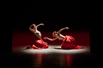 La soirée avait aussi commencé sous le signe d'une noblesse teintée d'impertinence avec Bella Figura, entré au répertoire de la compagnie en 2001. Si le XVIIIème siècle nous était conté par Jiří Kylián, il prendrait la figure de ces pages d'esprit, délicatement tournées. Séquence après séquence, en justaucorps sur fin collant noir ou en jupe à paniers de soie écarlate, les danseurs déploient un vocabulaire gestuel subtil et sophistiqué. Les lignes sont belles, élancées. On aime le LENTO qui ouvre le ballet, avec Alice Renavand et Alessio Carbone, puis l'ANDANTE avec Laetitia Pujol et Alexis Renaud. Un autre ANDANTE permet à une étonnante Dorothée Gilbert de les rejoindre, en poupée articulée, soutenue par Alessio Carbone. Ils clôtureront dans le silence ce ballet qui joue du clair-obscur et découpe l'espace scénique à coups de grands pendrillons noirs.