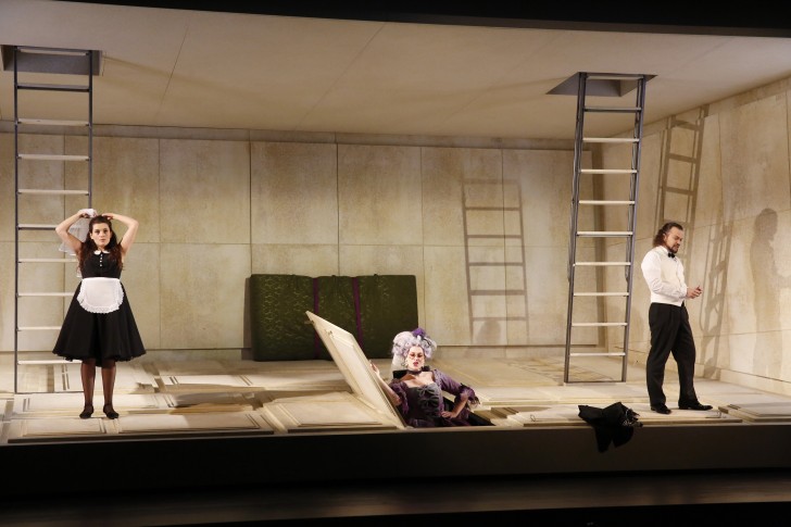 En effet, l'intelligente mise en scène des Noces de Figaro par Stephan Müller de 2006 a ici été remplacée par la vision d'un Markus Bothe qui, en s'appuyant sur des décors inefficaces mais spectaculaires (tiens ! on a ressorti les échelles, si prisées dans les mises en scènes d'il y a une quinzaine d'années !) s'empêtre dans un récit laborieux abandonnant les enjeux d'entre les personnages. Ainsi, l'aspect sociétal entre le Comte et Susanna n'est qu'à peine ébauché. La passion amoureuse de Cherubino pour la Comtesse se transforme en séance d'attouchements sexuels inaboutis entre lui, la Comtesse et Susanne. Sans parler de l'incongruité de la première scène de Figaro comptant des billets de banque tout en se préservant d'une situation scabreuse avec Marcellina (qui dans le livret s'avère être la mère de Figaro !) Alors qu'il n'existe presqu'aucun opéra où la musique et le livret ne sont aussi clairs que dans les Nozze di Figaro pourquoi donc vouloir à tous prix en changer l'esprit ? Pauvre Lorenzo Da Ponte et pauvre Mozart !