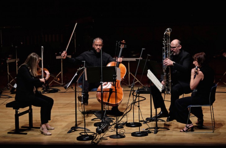 Si la voix est absente dans We met as Sparks (Nous nous sommes rencontrés comme des étincelles) de Franck Bedrossian, le court poème d'Emilie Dickinson, dont le compositeur emprunte ici le titre, sous-tend l'écriture musicale et draine en profondeur la trajectoire de l'œuvre. Bouleversante, elle nous plonge au cœur de la matière, dans un rapport très intime au son travaillé avec la sensibilité exacerbée du compositeur. Les instruments les plus graves de ce quatuor très atypique (flûte basse, clarinette contrebasse, alto et violoncelle) investissent le plus souvent leur registre aigu et saturé (harmoniques et sons fendus) dont le compositeur fait son miel. Si les mots du poème – silex, étincelle, ombre et lumière – semblent jaillir de chaque éclat de matière, le mouvement de l'archet sur le violoncelle en reproduit les lettres comme le ferait le bruit du crayon sur la feuille. Coup de chapeau aux quatre (super) solistes, Odile Auboin, Eric-Maria Couturier, Emmanuelle Ophèle et Alain Billard quasi fusionnels ce soir dans cette œuvre éblouissante qu'ils ont créée en octobre 2015 à Essen.