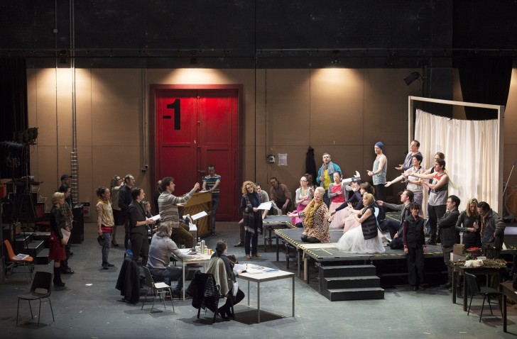À la façon dont Britten, autre Orpheus, l'a tenté dans son Let's make an opéra, elle nous offre sur « le » plateau le mode d'emploi ; en commençant par la fin : saluts vers la rampe, remerciements du directeur de théâtre en coulisses, puis vertigineux retour en arrière dans un décor de salle de répétition. Sur le mur du fond du très réaliste décor de Julia Hansen, on peut lire : Cinq semaines plus tôt… On y lira aussi, en un délectable procédé à la Annie Hall, les pensées secrètes de chacun, isolé alors du groupe par un halo de lumière : complicité garantie avec la salle, fonctionnant à plein jusqu'à l'entrelacs vertigineux des affects précédant l'entracte. Cette radiographie du spectacle en train de se faire évite minceur autant que prosaïsme, irriguée qu'elle est par une vraie tendresse pour tous, une foule de bonnes idées, de vrais instants de grâce (le délectable exercice d'échauffement sur les 50 secondes de l'ineffable Prélude en apesanteur du II !) Entre sourire et soupir, le spectateur, homme de toutes les confidences, saura tout de l'envers du décor.