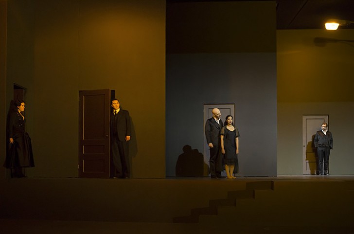 Ils ne sont pas si nombreux, les spectacles dont la première image suffit à faire savoir que l'on va passer une soirée mémorable. Dès le premier accord, le rideau se lève sur un portrait géant du serial lover d'emblée griffé d'un « Wanted ». Lorsqu'arrive l'allegro, le portrait se lève à son tour sur le tracé impeccable d'une boîte rectangulaire où marron et vert, couleurs habituellement abonnées au glauque, se disputent pourtant classieusement la vedette. Un couloir percé de portes. L'on assiste au ballet froidement réglé de la consommation sexuelle d'un séducteur quasi immobile : celle, entre jardin et cour, d'une incessante translation de femmes vêtues, comme le héros, d'un noir huilé très chic, incluant même un double de Leporello ! Le couloir s'efface ensuite pour donner à voir l'envers du décor : présenté sous une virtuose multiplicité d'angles, un hôtel où le Don s'adonne à quelques nuances bien sombres avec Donna Anna pendant que, dans la chambre voisine, un Commandeur (quel hasard !) de plus d'un quintal s'abreuve à la beauté gracile d'une jeune femme. Alerté par le bruit au-delà de la cloison, il y découvre… sa fille, avant d'être frappé exactement là où il péchait la seconde d'avant. Ce Commandeur au sexe ruisselant de sang a été, est aussi, un Giovanni. On est loin de l'auguste vieillard effarouché de la tradition, mais si près des enjeux sexuels de l'œuvre.
