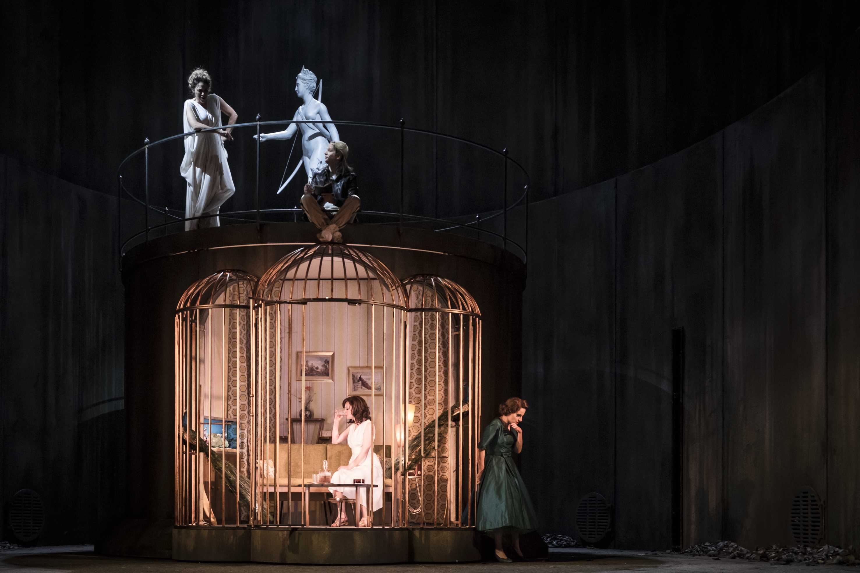 Puisque Calisto finit en plantigrade, Mariame Clément place prologue et épilogue dans la fosse aux ours d'un zoo, où chacun vaque à ses occupations. Mais dès la descente littérale des cieux de Jupiter et Mercure, le centre rotatif du dispositif ainsi que les habiles costumes conçus par Julia Hansen font l'objet de nombreuses transformations. Abandonnant sa tenue initiale de secrétaire, Diane se conforme à son imagerie antique traditionnelle. Jupiter apparaît en bourgeois en goguette et un peu magicien, coiffé d'un haut-de-forme et fumant un cigare, seuls attributs qu'il conservera en se transformant en Diane. Mercure, éternel voyageur, se présente en routard tandis que Junon est enfermée derrière des barreaux, dans la cage ou la prison du mariage, noyant son chagrin dans l'alcool et flanquée de ses deux paons qui se concrétiseront dans les costumes chamarrés des deux Furies. À ce propos, Mariame Clément, en reprenant pour Junon le costume de femme au foyer américaine des années cinquante qu'elle avait pour Platée, se cite elle-même en un joli clin d'œil au public strasbourgeois. Le chaste amour d'Endymion se traduit par les caresses qu'il adresse sous la clarté lunaire à une statue de Diane d'un pur classicisme. Quant à Pan et sa suite de Satyres, ils exhibent gaillardement leur abondante pilosité et leurs attributs virils (que les âmes prudes se rassurent, il ne s'agit que de prothèses de caoutchouc !). Par sa direction d'acteurs précise et variée, Mariame Clément parvient à donner vie et caractère à chacun des nombreux personnages et quand arrive le tableau final, où comme il se doit la Grande Ourse resplendit sur un fond étoilé, on est tout surpris d'avoir traversé ces trois heures de spectacle sans aucune baisse de tension et sans que jamais l'ennui guette.