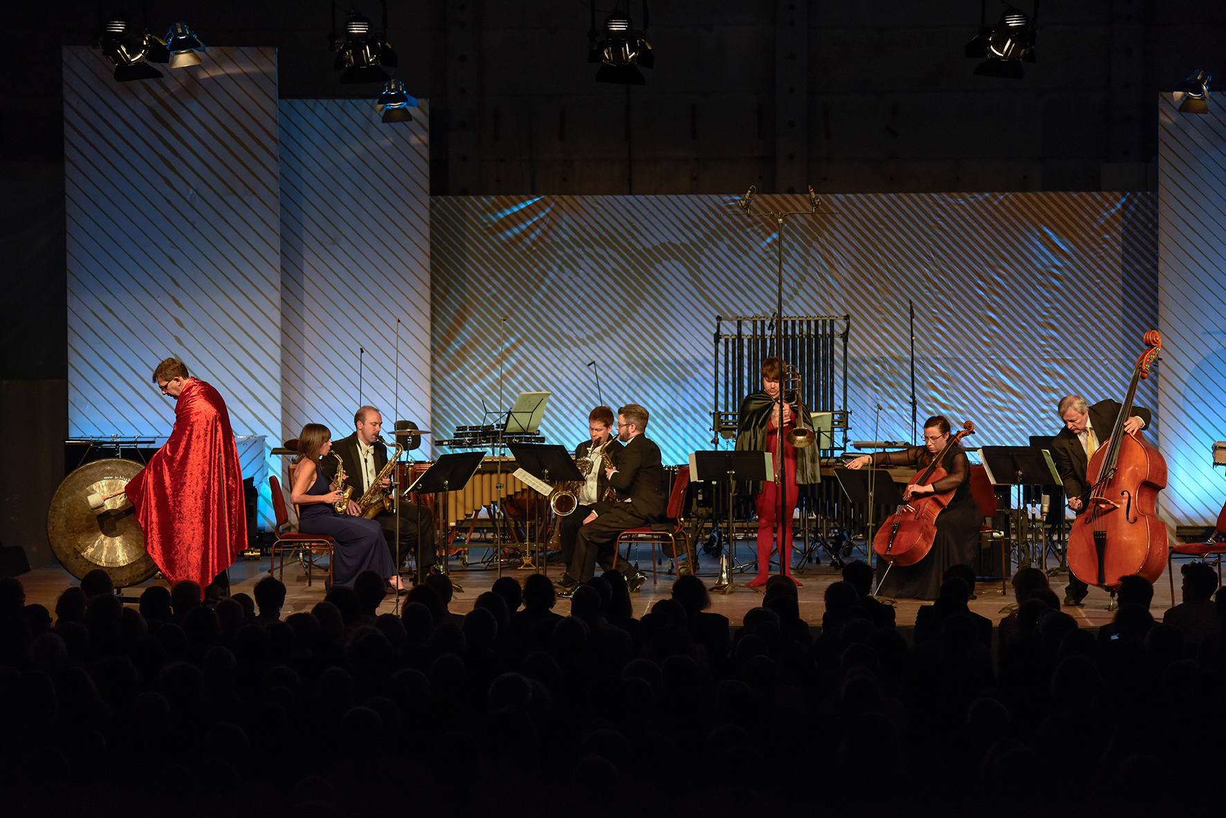 La dernière œuvre de la soirée revient à Sofia Gubaïdulina. Verwandlung est composée pour trombone, quatuor de saxophone, violoncelle, contrebasse et tam-tam. Si la trompette avait largement convaincu dans la pièce précédente, ce n'est rien par rapport à la prestation du tromboniste Frederic Belli. La pièce démarre sur un développement de thèmes courts par le quatuor de saxophones avant de conduire à une certaine cacophonie, interrompue au fur et à mesure par le trombone, débarquant du fond de scène en cape et costume moulant, avant de prendre le dessus grâce à une partition qu'il maîtrise par cœur, sans pouvoir se référer à l'écrit puisqu'il bouge en permanence dans la salle. Il développe ensuite un long soli interrompu par ses propres hurlements, avant que les autres instrumentistes ne recommencent à oser jouer, et laissent intervenir en fin de pièce les cordes et le tam-tam, ce dernier également affublé d'une cape pour traverser la scène et sonner le gong final.