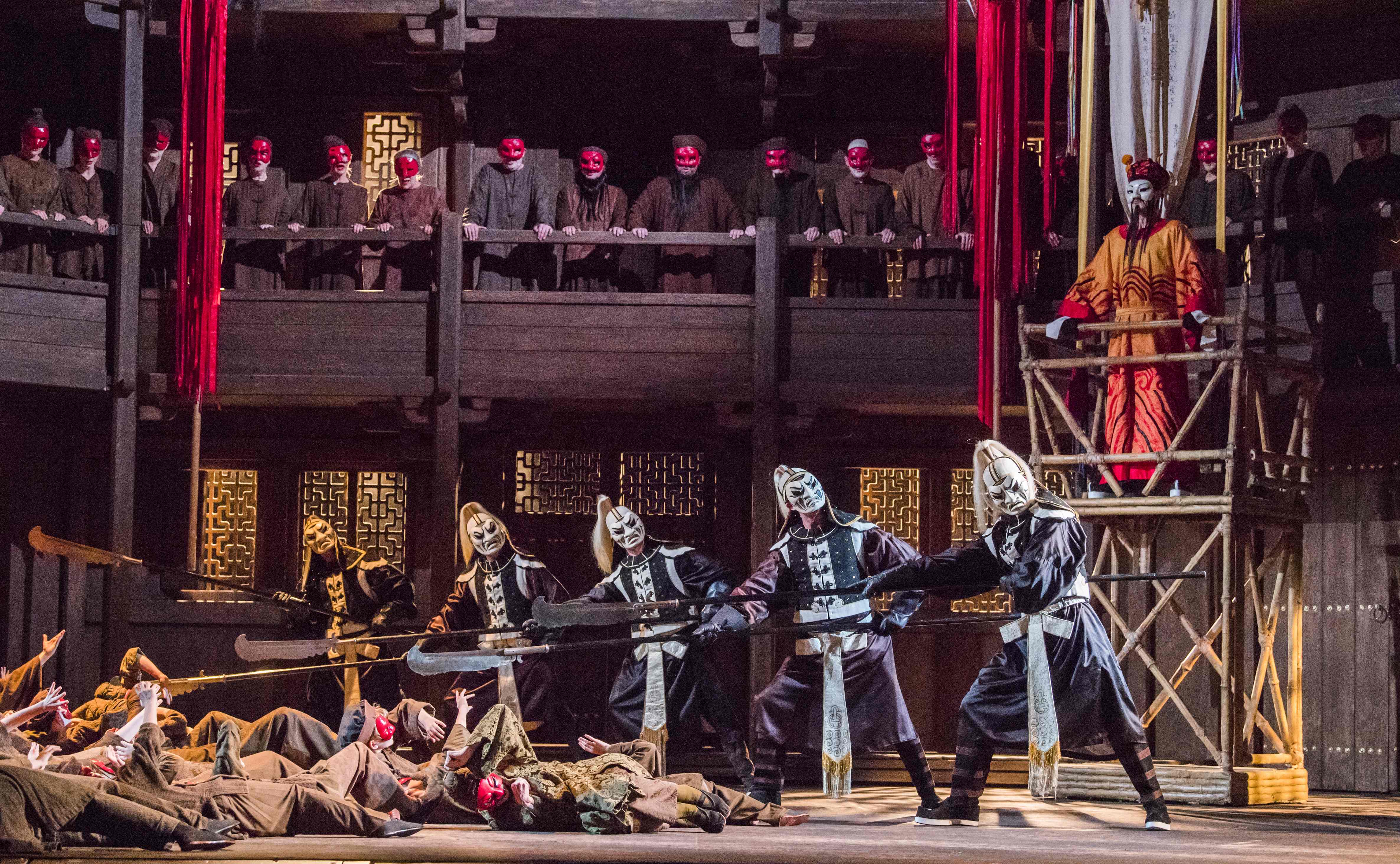 La mise en scène d'Andrei Șerban a 33 ans, mais lorsqu'une production est intelligente et superbement construite, elle ne vieillit pas. Ainsi en est-il de la Turandot du Royal Opera House et d'une cour de palais chinois pourtant bien inspirée d'un intérieur de théâtre élisabéthain. La couleur de bois sombre du décor de Sally Jacobs s'oppose aux teintes claires et vives des costumes et des masques, très importants dans cette proposition où tout le monde avance à couvert dans un monde dominé par une héroïne surpuissante.