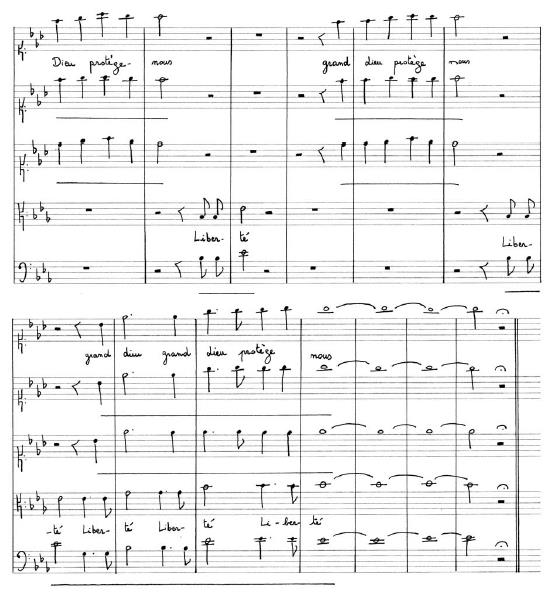 Les protagonistes se séparent en deux chœurs, les révolutionnaires prenant parti pour Lucile, l'autre chœur s'alliant à la sordide abbesse attachée à l'Ancien Régime. Cette technique musicale du désordre ne fait que mieux ressortir la solennité et la sérénité du Lento Maestoso final.