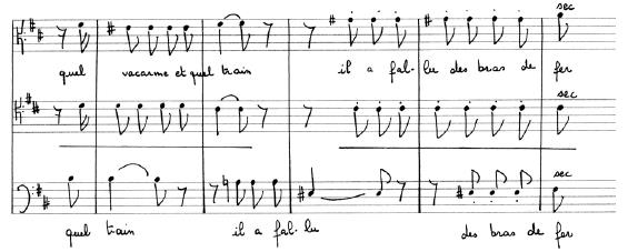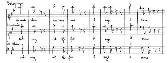 Le tumulte de l'action est reproduit par la prosodie du chœur puisque Le Sueur fait systématiquement sonner toutes les voyelles finales. Les trois personnages principaux, quant à eux, chantent leur peur et leur détresse à travers une ligne mélodique en valeurs longues. Mais là aussi, le compositeur place intentionnellement des accents musicaux sur des syllabes atones.