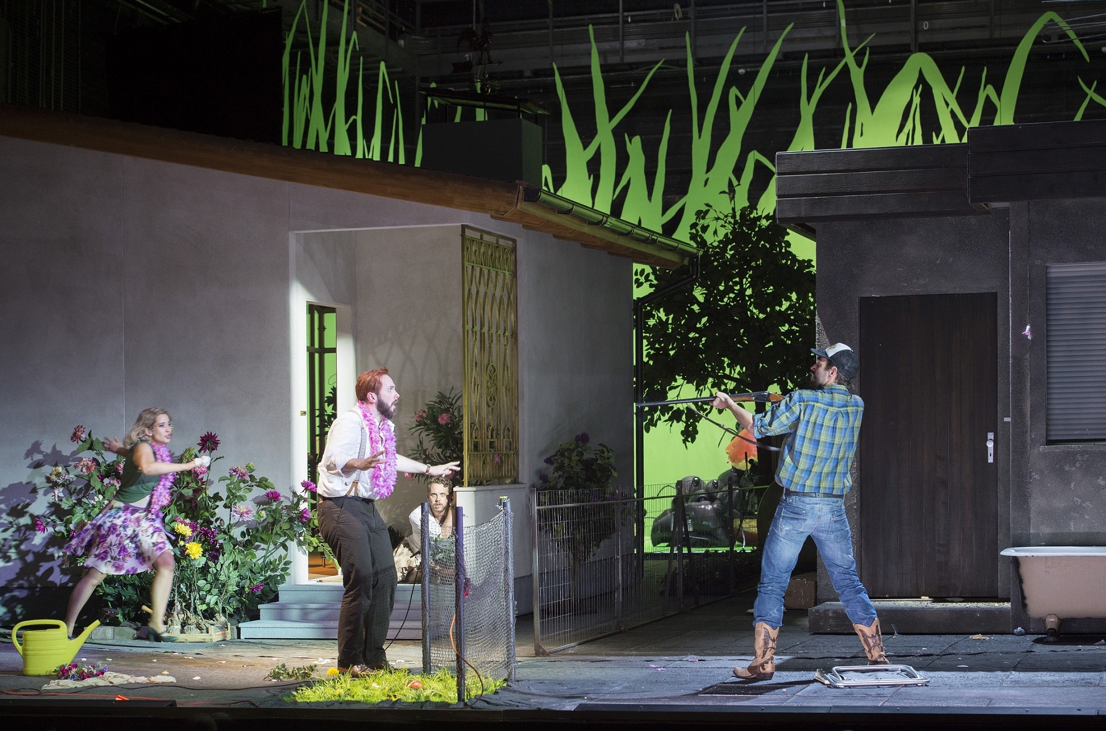 La mise en scène de Tobias Kratzer, partie d'une idée simple, parvient à restituer sur scène la violence des oppositions manichéennes entre le Bien et le Mal que Louis de Cahusac aime à dessiner. C'est cette violence, dépassant en quelque sorte son objet, qu'il met en scène, en plaçant côte à côte la maison d'un prolétaire et celle d'un cadre un peu coincé : Abramane et Zoroastre, donc. Le conflit de voisinage dégénère, avec une gradation d'un humour incontestablement communicatif – jusqu'au dénouement, qui est beaucoup moins drôle. Le livret peu subtil se prête bien à de tels détournements, et Kratzer peut s'appuyer sur un décor inventif en même temps que brillamment illusionniste, qui fait se succéder par une scène tournante les scènes dans la rue, dans l'une ou l'autre maison, ou encore dans le jardin : cette gourmandise théâtrale met à juste titre le spectateur en joie, à défaut de l'amener dans les hautes sphères spirituelles auxquelles aspirait Louis de Cahusac avec un optimisme quelque peu excessif.