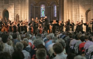 Le soir, le Jeune Orchestre de l'Abbaye joue sous la direction brillante et énergique de William Christie : instruments anciens, orchestre debout (hormis bien sûr les violoncellistes), l'ensemble tranche déjà visuellement avec les orchestres symphoniques ou de chambre usuels. Impact visuel renforcé par la direction de Christie : reprises effectuées, accents soulignés un peu comme le faisait feu Harnoncourt, allegrettos pris avec vivacité et rebond rythmique, cadences des bois à la fin des trios, les idiosyncrasies abondent pour un résultat passionnant et d'autant plus remarquable que Christie a souligné le peu de répétitions nécessaires pour monter ce concert. L'excellente Emmanuelle de Negri, soprano partenaire habituelle de Christie, triomphe dans deux airs de Mozart.