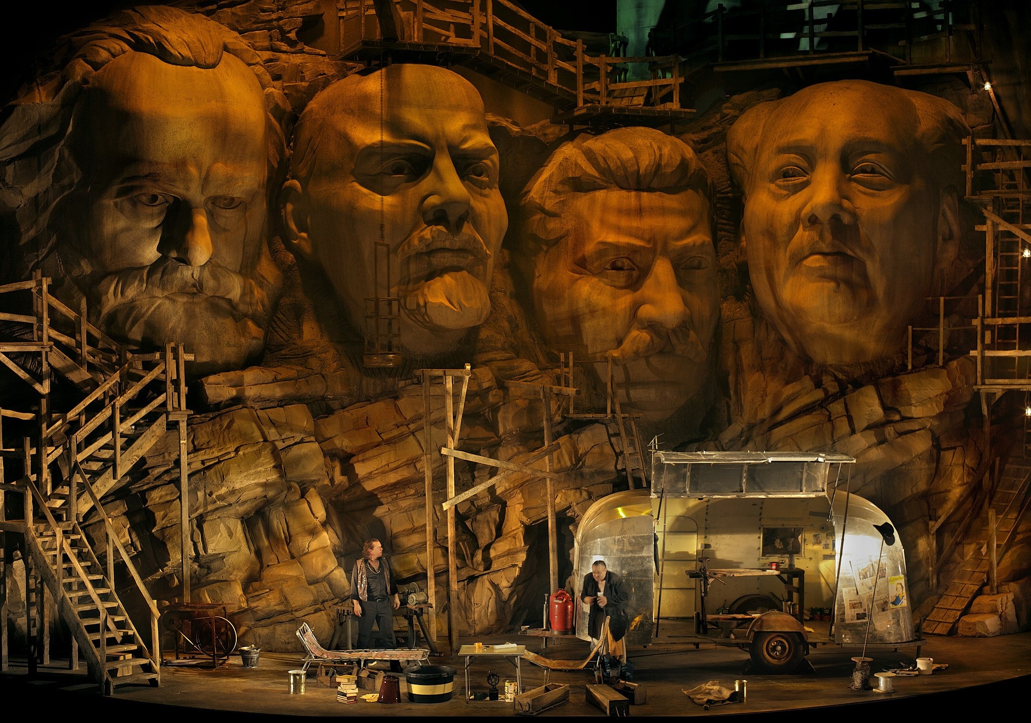 Pour ce Siegfried en Allemagne, l'œil glisse d'un vertigineux Mont Rushmore du communisme (où l'on finit de graver, de Marx à Mao, une très darwinienne chaîne de l'évolution des idéologies prolétariennes) au modernisme glacial de la Berlin Alexanderplatz. Le pétrole maudit par Alberich n'est plus visible que dans ses dérivés plastiques. Scrutés par une direction d'acteurs au millimètre, les personnages y traînent le constat désabusé de leur dérive. Wotan n'a jamais eu, dans ce Ring, aucun des signes de noblesse dont les puristes (ont-ils lu le livret ?) veulent encore parer l'image d'un héros en lambeaux. Le Wotan de Castorf a été le patron d'une station-service, puis celui d'un puits pétrolifère. Plus coureur que Wanderer, le voici cette fois maquereau en chef d'un réseau de prostitution. Erda fait partie du vivier, de même que l'oiseau, qui déniaisera Siefgried, avant l'heure Brünnhilde, sous un réverbère. Le Waldvogel de Castorf, apparu à l'heure bleue sous l'horloge universelle Urania, nous vaut des Murmures de la forêt d'une absolue poésie nocturne. Le costume enchanteur (immense plumes mues avec une grâce infinie) qu'Adriana Braga Peretzki a conçu pour l'animal est pour beaucoup dans ce qui restera comme une des plus belles scènes de ce Ring. L'ours, autre espèce choyée de près par Castorf, habituellement expédié au bout de quelques mesures, devient lui aussi un des personnages principaux. Pas spéciste pour un sou, et, de ce fait, attentif à toute sorte de souffrance, Castorf fait de ce rôle muet une sorte d'homme (et de femme?) à tout faire. Une sorte de veilleur aussi puisque l'« ours » passe une bonne partie de l'Acte I à feuilleter et à préserver les nombreux volumes que Mime possède dans sa caverne-caravane, volumes en revanche traités de très haut par la morgue du Wanderer. Si, comme Chéreau naguère, Castorf nous débarrasse de la fastidieuse forge de l'épée (Siegfried ne faisant qu'assembler les morceaux de la kalachnikov, glaive tristement contemporain, qui tuera Fafner), on se demande en revanche pourquoi le metteur en scène réintroduit Nothung dans l'attirail de son héros.