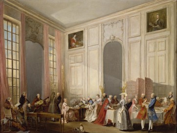 Grâce à Friedrich Melchior Grimm, les portes des grandes maisons aristocratiques s'ouvrent ainsi au petit Mozart et à sa famille. Preuve en est avec l'huile sur toile de Michel Bartélémy Ollivier intitulée Le thé à l'anglaise dans le salon de quatre glaces où le jeune Mozart se produit devant la cour du prince de Conti, l'un des plus grands mécènes de son temps et fin mélomane. Le dispositif détaillant la présence d'éminents personnages représentés sur cette toile illustre avec pédagogie l'effervescence autour de l'enfant prodige. Mais encore une fois, l'attention se porte davantage au catalogue déjà consistant des œuvres du petit musicien composées jusqu'en 1768, manuscrit autographe de son père Léopold de plus de 250 ans.